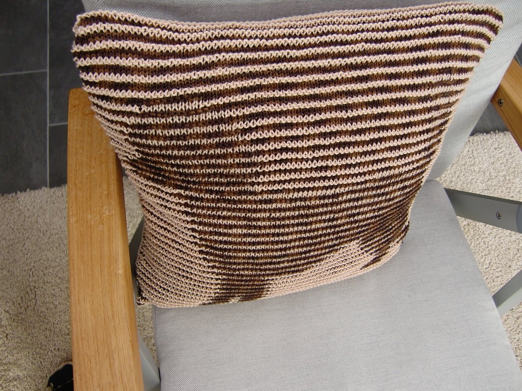 Das gezeigte Kissen ist mit Schachenmayr Catania und Catania color gestrickt(100 % Baumwolle, Lauflänge 125 m auf 50 g). Selbstverständlich steht es Ihnen frei, jede andere Wolle mit ähnlichen Eigenschaften zu benutzen.