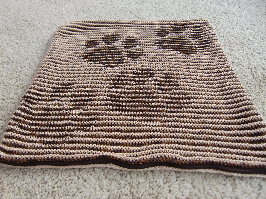 Dieses Kissen ist ein tolles Geschenk für Hundefreunde. Die eine Seite zeigt einen Pudel, die andere eine Pfotenspur. Das Kissen ist in einem Stück durchgestrickt, es ist aber auch möglich, die beiden Motive einzeln zu stricken und dann zusammenzunähen.