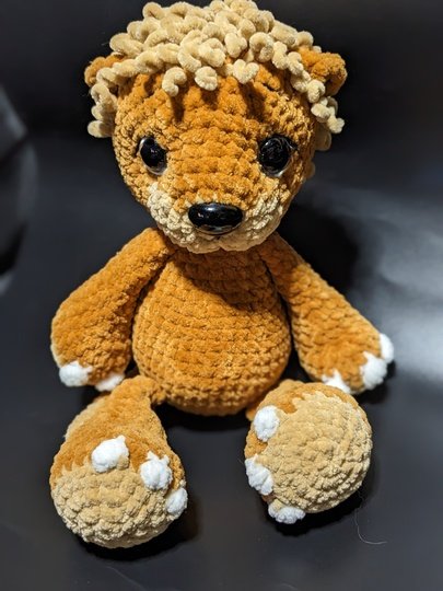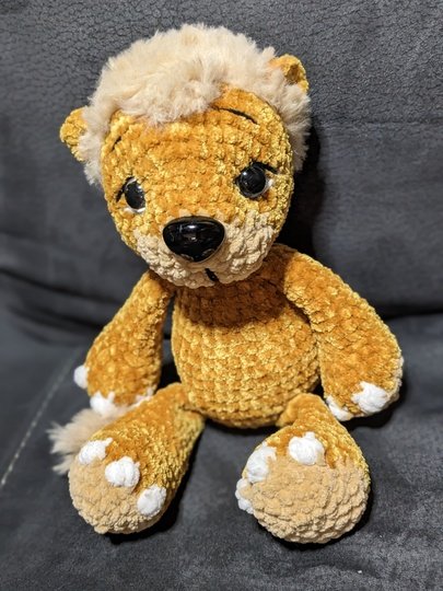 Mit einer Häkelnadel in Stärke 4,0 und der in der Anleitung angegebenen Wolle - Chenille 100 g /120 m - wird der Löwe ca. 30 cm groß.