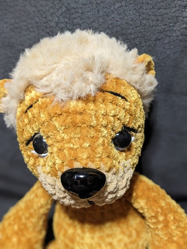 Besonders schön ist, dass man bei diesem Löwen ausschließlich den Kopf annähen muss. Arme und Beine und Schwanz werden im Verlauf der Arbeit mit eingehäkelt und die Ohren werden herausgearbeitet.