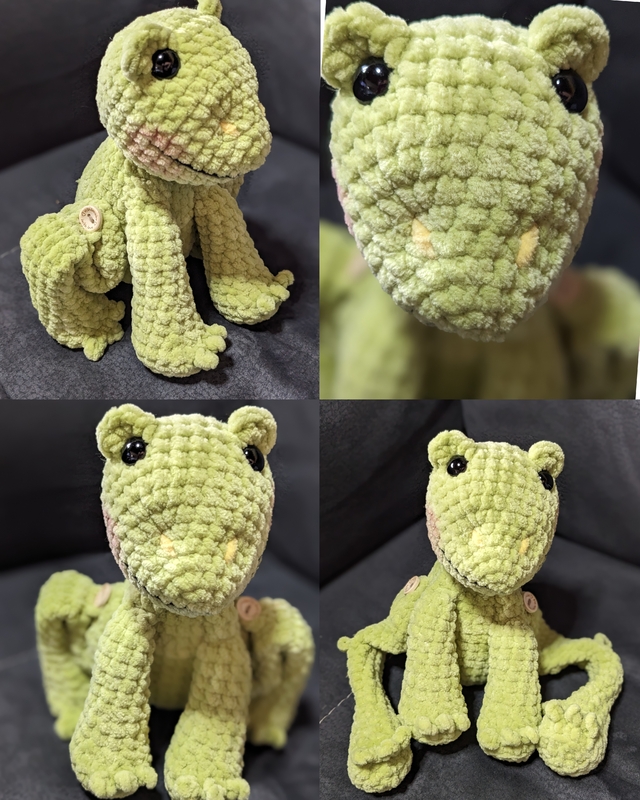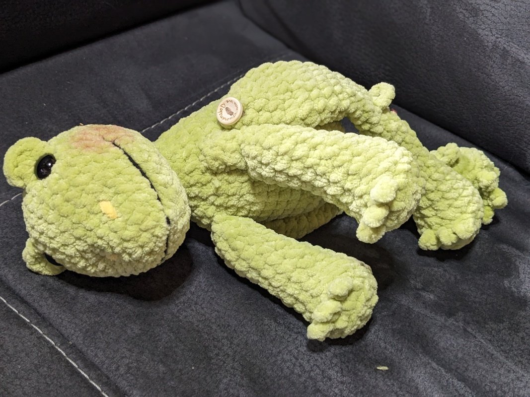 Besonders schön ist, dass man bei diesem Frosch ausschließlich die Hinterbeine annähen muss. Augenbogen und Vorderbeine, werden im Verlauf der Arbeit mit eingehäkelt.