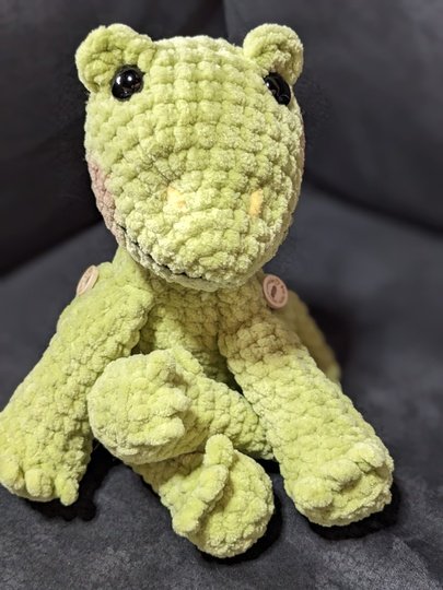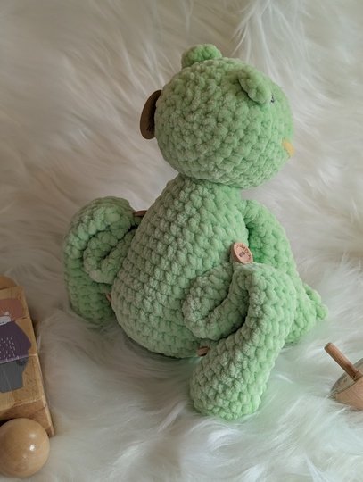 Mit deiner Häkelnadel in Stärke 4,0 und der in der Anleitung angegebenen Wolle - Chenille 100 g /120 m - wird der Frosch ca. 26 cm groß.
