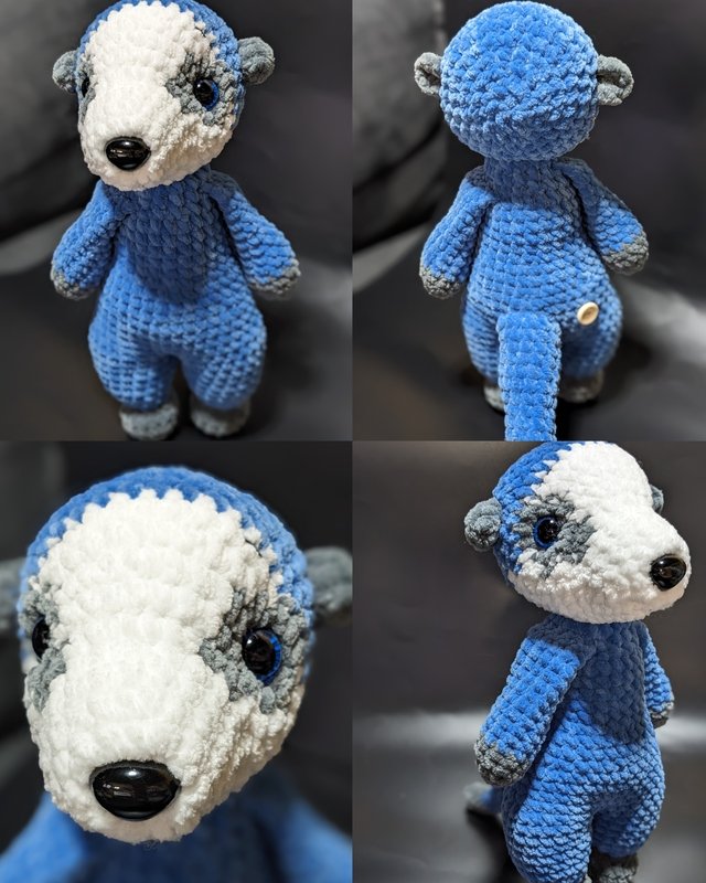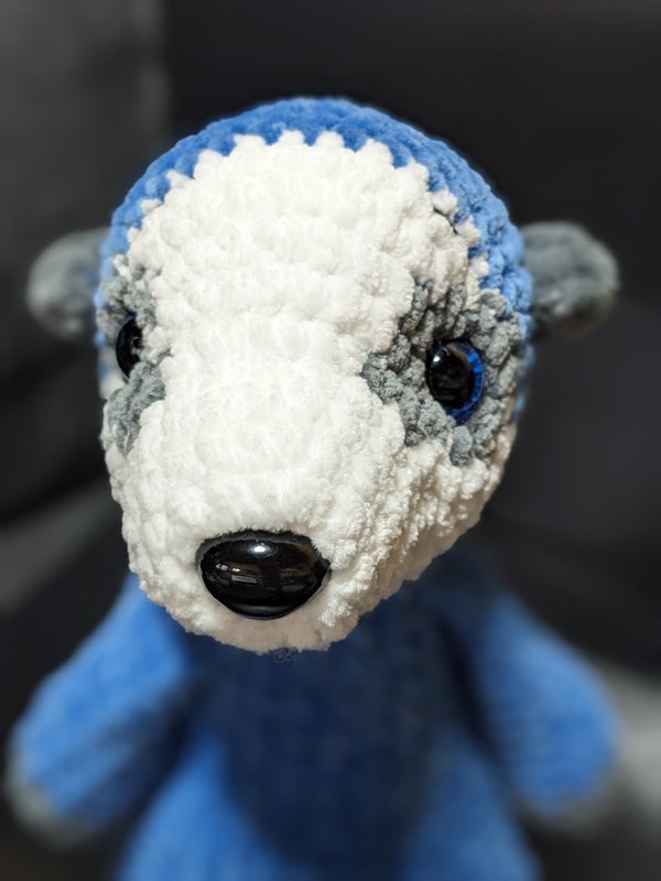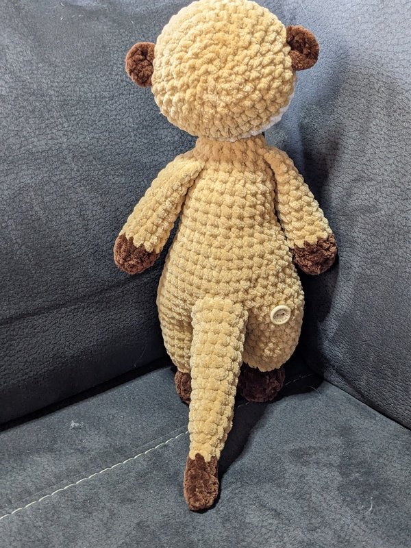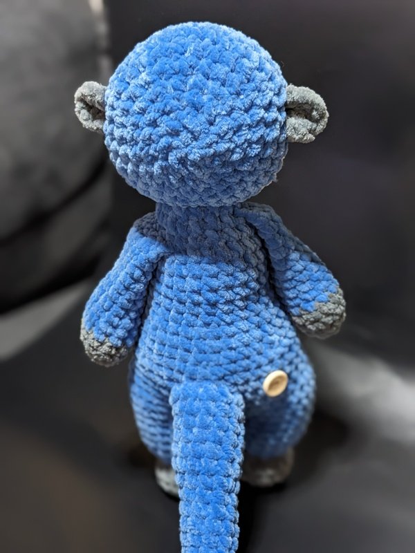 Besonders schön ist, dass man bei diesem Tier ausschließlich den Kopf und den Schwanz annähen muss. Arme und Beine werden im Verlauf der Arbeit mit eingehäkelt und die Ohren werden herausgearbeitet.