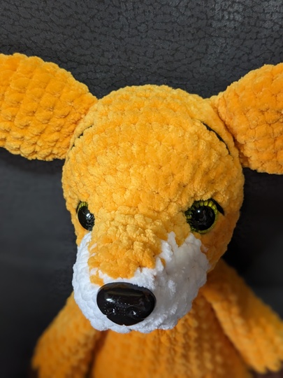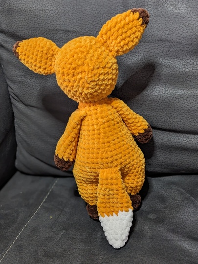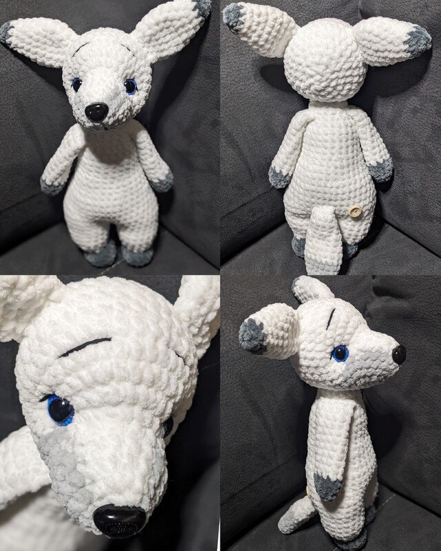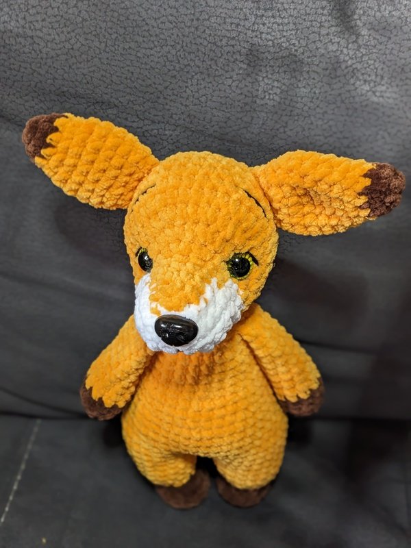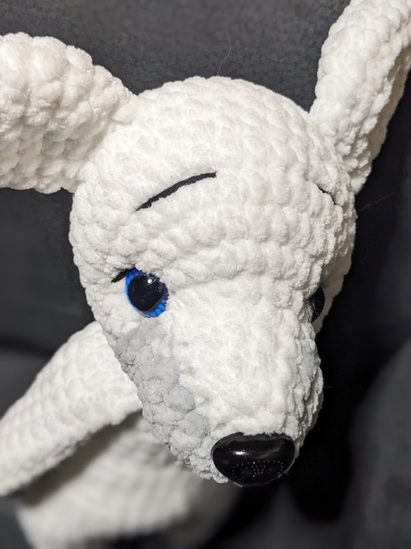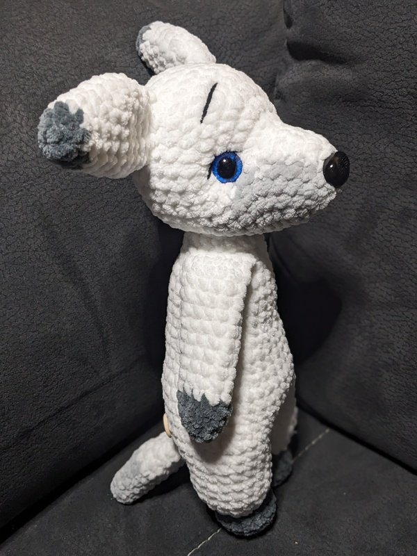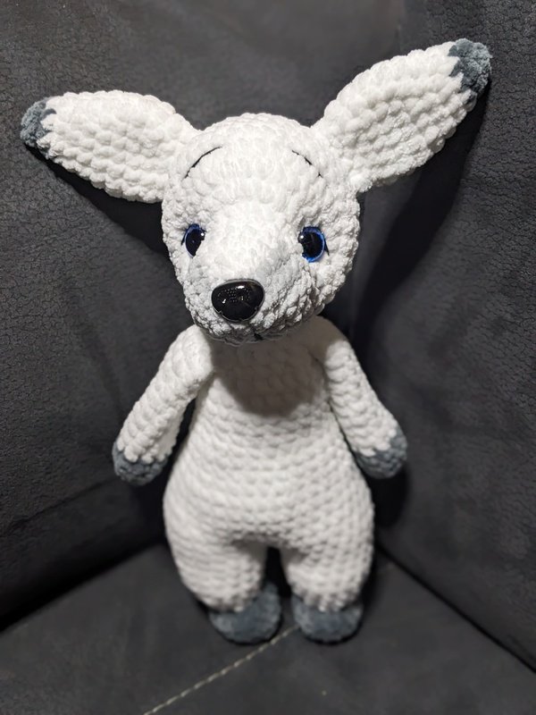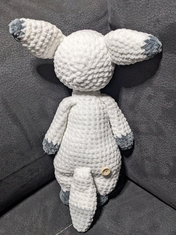 Besonders schön ist, dass man bei diesem Tier ausschließlich den Kopf annähen muss. Ohren, Arme und Beine und Schwanz werden im Verlauf der Arbeit mit eingehäkelt.