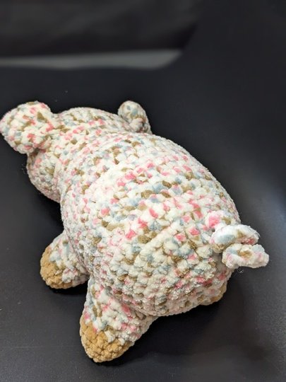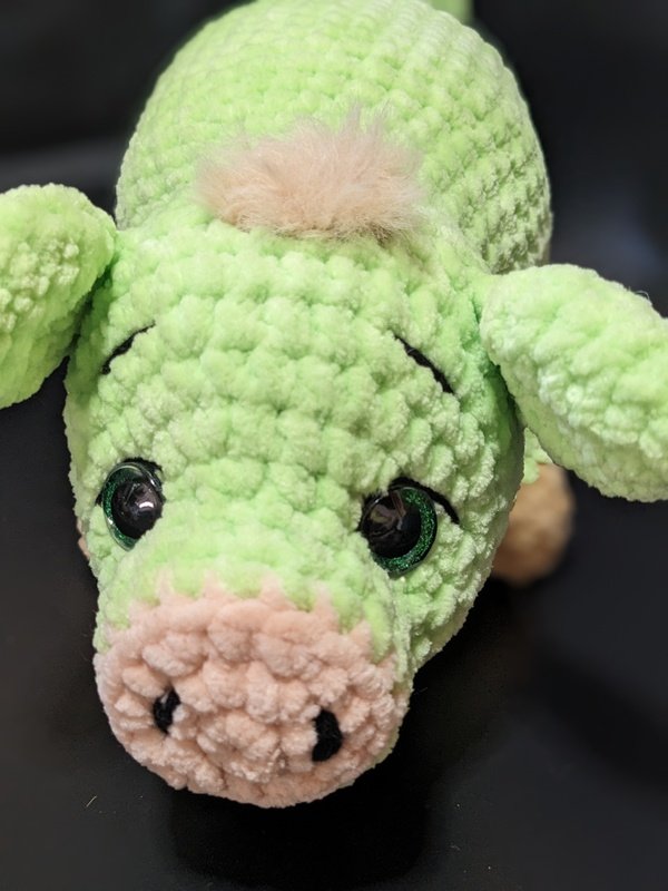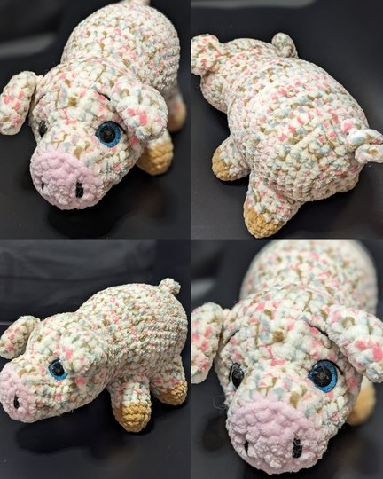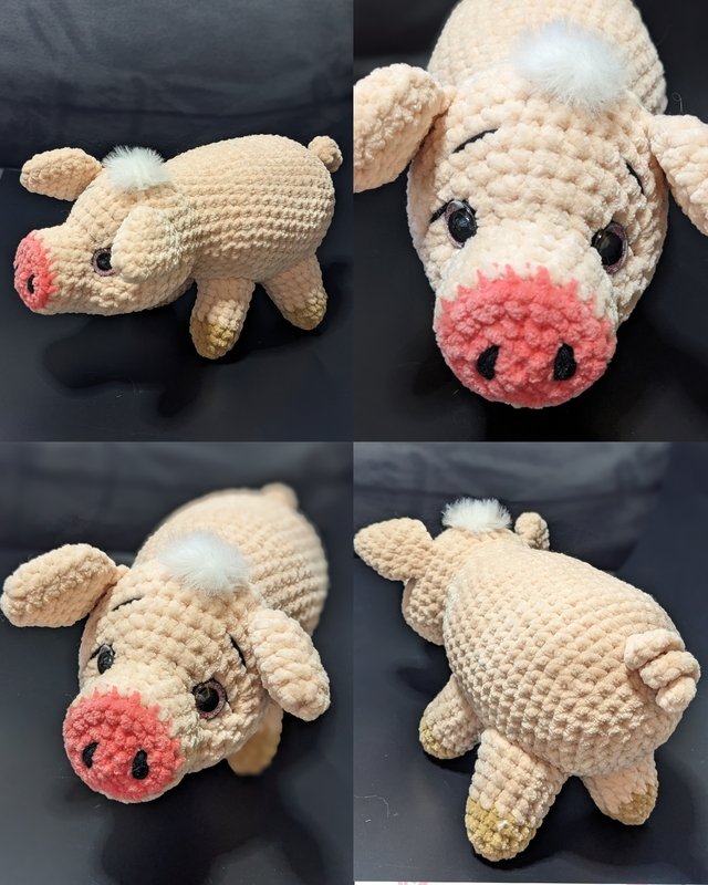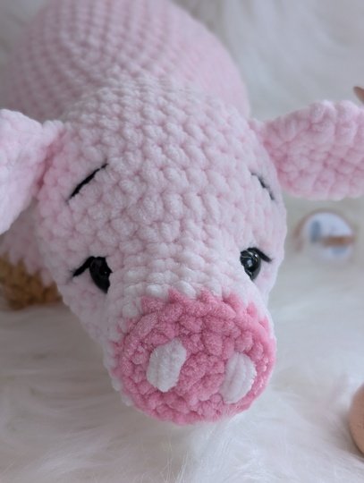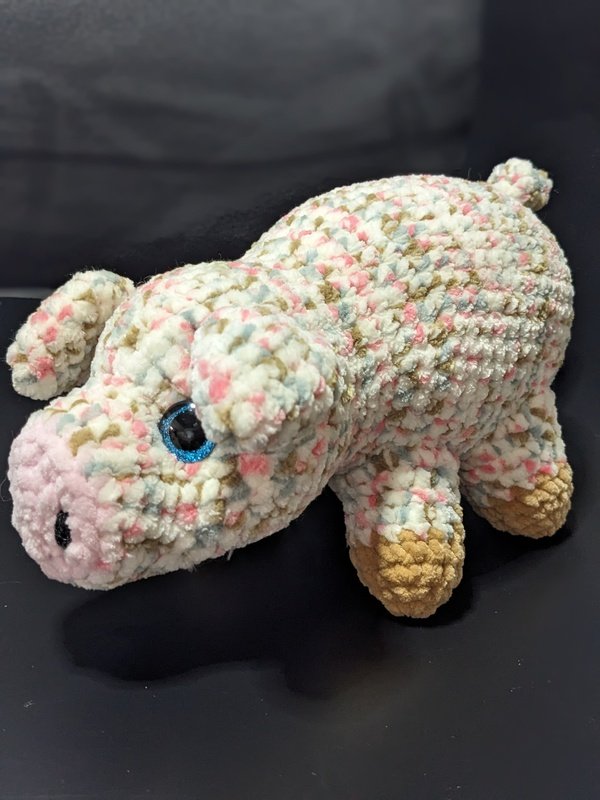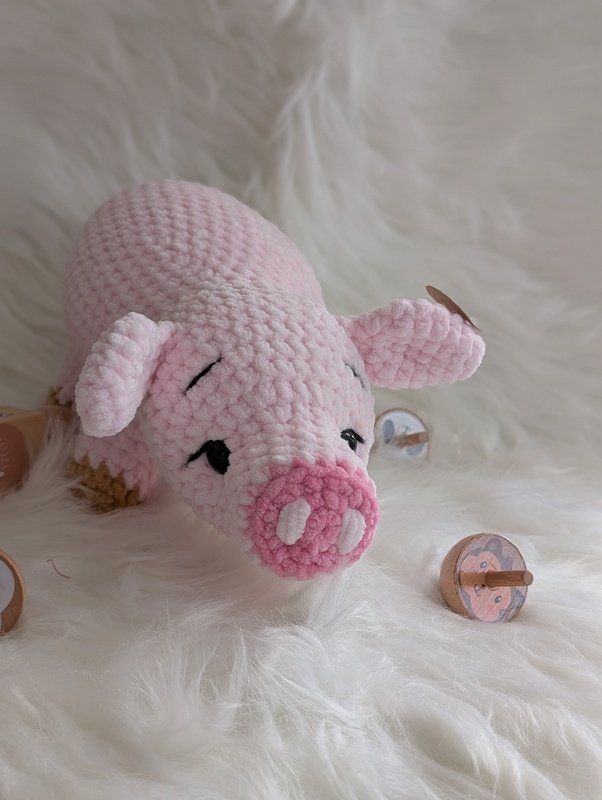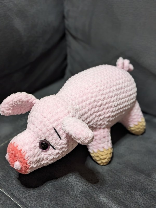 Mit deiner Häkelnadel in Stärke 4,0 und der in der Anleitung angegebenen Wolle - Chenille 100 g /120 m - wird das Schwein ca. 25 cm groß.