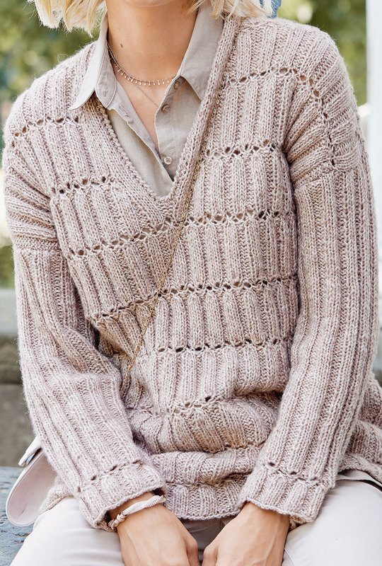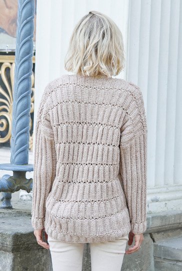 Der regelmäßig wiederkehrende Smog-Effekt dieses Rippenpullis aus einem Baumwolle-Schurwolle-Alpaka-Mischgarn entsteht durch zusammengestrickte Maschen, die gleich wieder zugenommen werden. Ein toller Trick, der für die spannende Optik sorgt. Der V-Ausschnitt wird durch betonte Abnahmen gebildet, sodass entlang der Kante ein schmaler Glatt-rechts-Streifen verläuft. Die nach oben hin breiter werdende Schnittführung ergibt eine überschnittene Schulterpartie. So elegant wie zurückhaltend die Farbe: Camel; sie zeugt von Understatement und fällt dennoch ins Auge. Eine Anleitung ist für die Größen 38/40, 42/44 und 46/48 vorhanden.