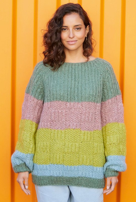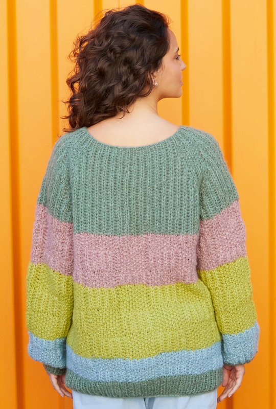 Colorblocking nennt man einen Trend, der sich aus breiten Streifen in verschiedenen Farben zusammensetzt und der in dieser Saison sein Comeback feiert. Bei diesem Raglanpulli kommen zusätzlich auch Karo- und Rippenstrukturen aus Patent- und Perlmustern zum Einsatz. Zunächst werden gerade Teile bis zu den Armausschnitten gestrickt, deren Maschen dann für die Rundpasse auf eine Rundstricknadel genommen und alle vier Raglanschrägungen gleich rundum gearbeitet werden. Alle Bündchen und die Ausschnittblende werden als 1/1-Rippen in Graugrün gestrickt. Für Größe 38/40 gibt es eine Anleitung.