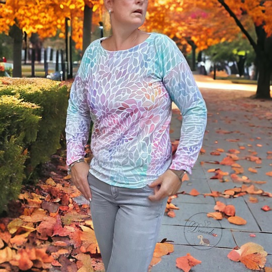 mit der seitlichen Teilung. Die Ärmel sind in 3/4- und Langarmlänge angelegt. Ausserdem ist auch eine Croptoplänge im Schnitt enthalten.