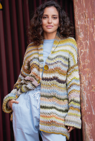 Wenn bei einem Verlaufsgarn so viele Farben aus dem Knäuel kommen, kann man eigentlich auf Muster verzichten. Wir haben trotzdem Rippenstrukturen für die Wellen-Optik hinzugefügt. Diese Strukturen sind im Prinzip Halbpatentmaschen, die geschickt zugenommen und wieder zusammengestrickt werden. Eine extra angestrickte Knopfblende erübrigt sich, sie wird gleich im Halbpatent mitgearbeitet und läuft am Ende um den Halsausschnitt weiter, so dass sich ein Schalkragen ergibt. Die vorteilhafte Länge der Jacke lässt so manches Kilo zu viel um die Hüften verschwinden. Eine Anleitung gibt es für die Größen 38/40, 42 und 44/46.