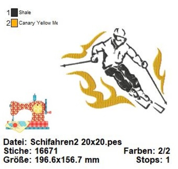 Diese moderne Stickdatei mit einem Skifahrer ist ein dynamisches und stilvolles Design, das in drei verschiedenen Größen geliefert wird. Das Design zeigt einen Skifahrer in Aktion, der eine Piste hinunterfährt, und vermittelt ein Gefühl von Geschwindigkeit und Abenteuer.