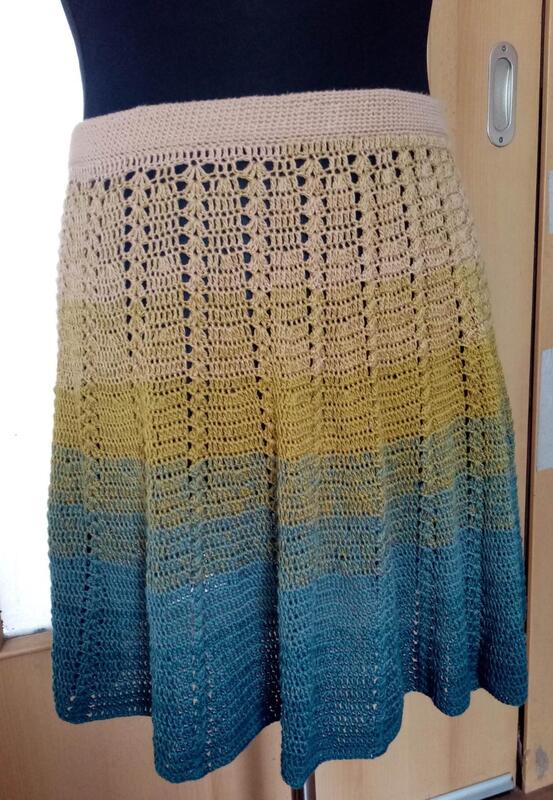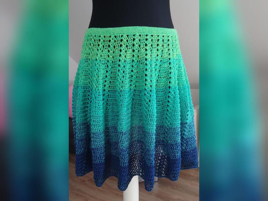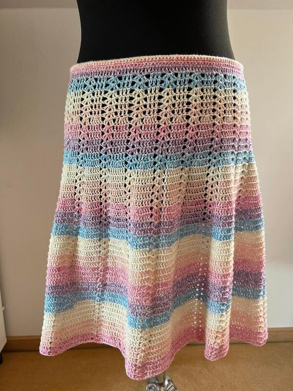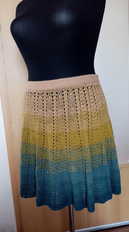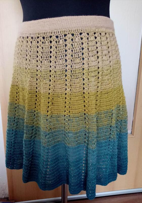 Wenn ihr dieselbe Variante, wie ich häkeln möchte (selbe Länge und Weite vom Rock), dann benötigt ihr pro Konfektionsgröße größer oder kleiner ca. 200m mehr bzw. weniger Garn.