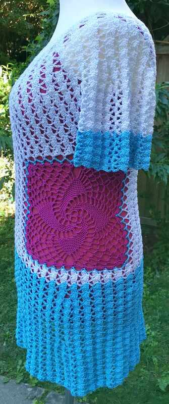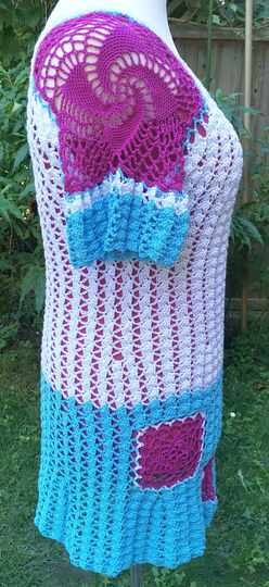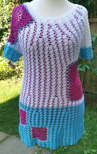 Für die weiß-bunte Tunika in Größe L mit 2 großen Quadraten Alize diva, ca. 1705 m, Häkelnadel Nr. 4 und 4,5.