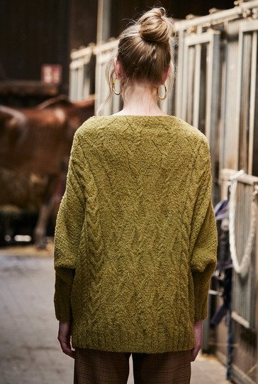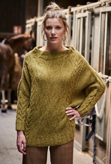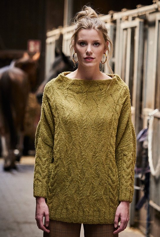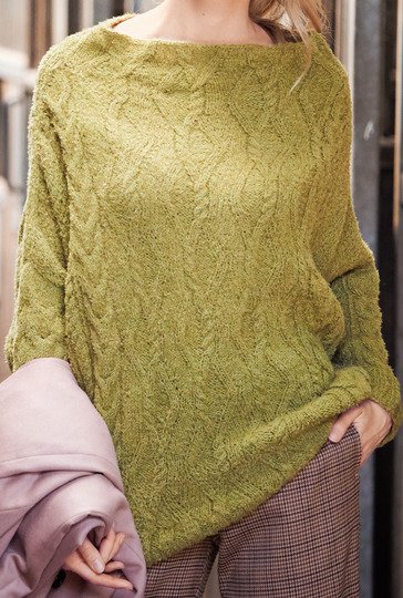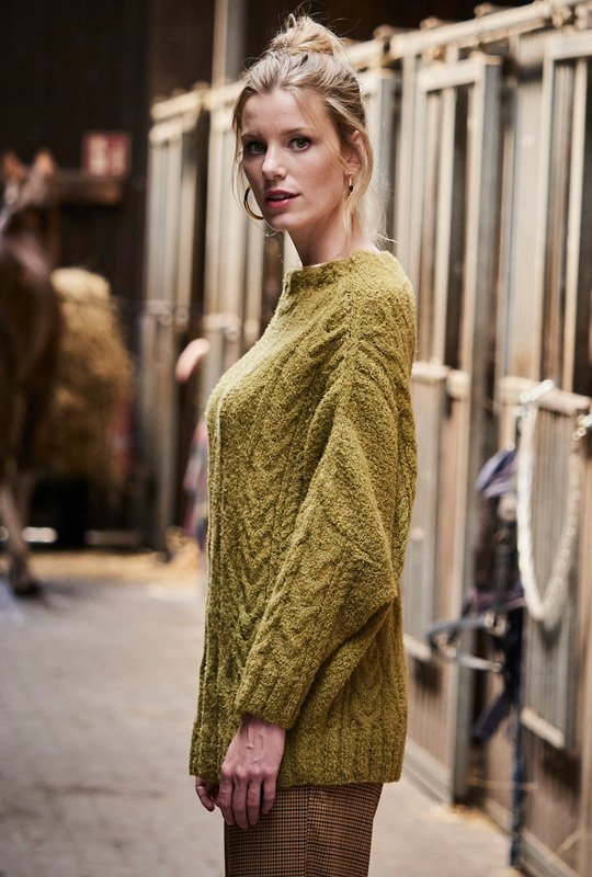 Mit seiner weiten Kimonoform gehört der moosgrüne Pulli zu den Trendsettern in dieser Wintersaison. Das kurzflorige Fransengarn aus Schurwolle mit Polyamid bildet die Grundlage für das ausdrucksstarke Zopf- und Rautenmuster, nach Art der Aranpullis – nur eben ganz modern, mit weit überschnittenen Schultern und weiten Ärmeln. Die Zopf-Rauten verlaufen nur in der Mittelpartie, beidseitig begleitet von großem Perlmuster. Wer gerne auch aufwändige Muster strickt, ist mit diesem Modell ganz im Element. Schmeichelhaft für einen schönen Hals ist der U-Boot-Ausschnitt. Die Anleitung gibt es zum Downloaden für die Größe. 36/38, 40/42 und 44/46.
