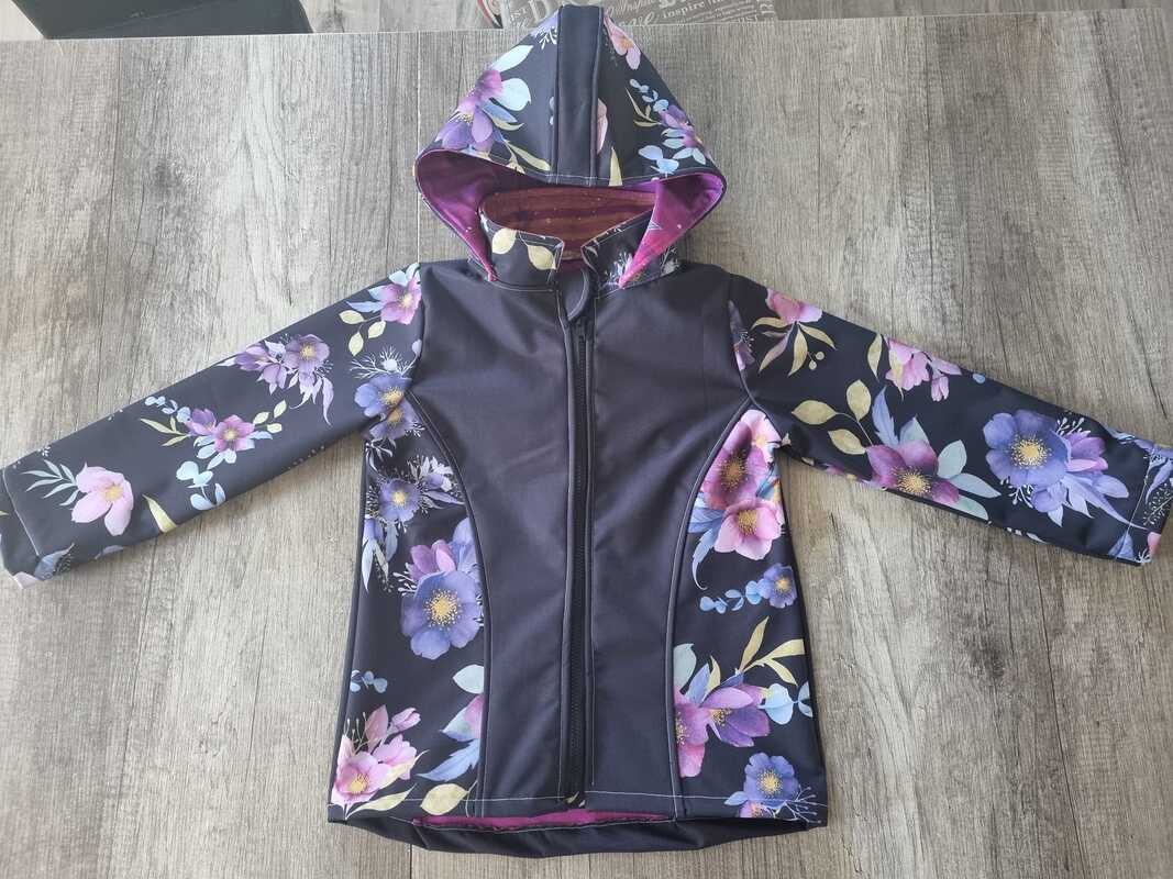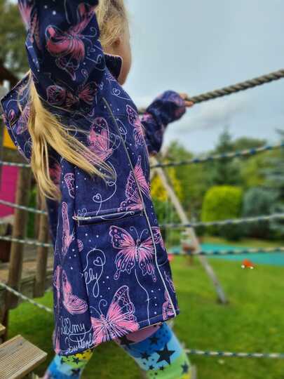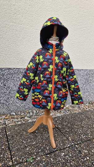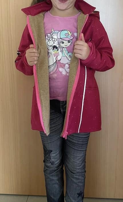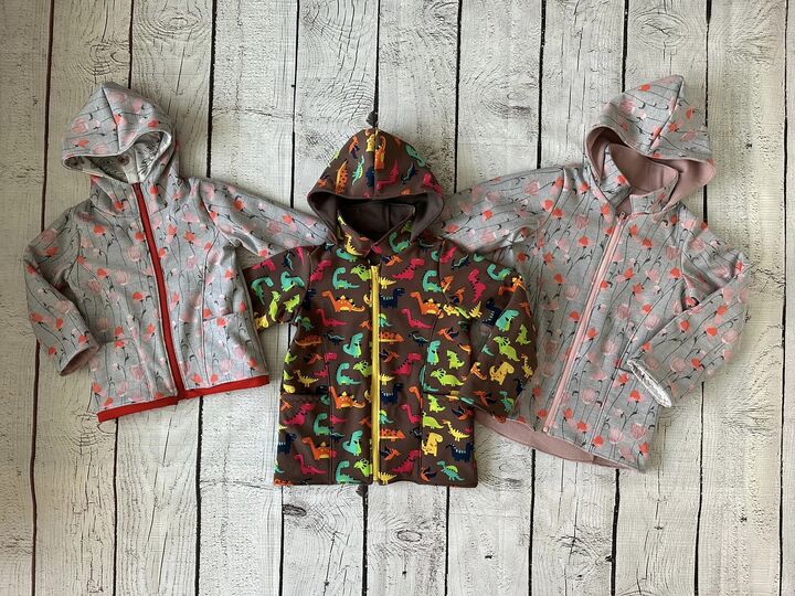 Gr. 110 – 164 umfasst der Schnitt in Einzelgrößen und hat genau wie die Babyversion vorn 2 Taschen, die einfach in die Teilung integriert werden können. Auch wenn sie als Softshelljacke bezeichnet ist – du kannst sie auch wunderbar aus Walk und anderen dickeren Outdoorstoffen nähen. Sie hat eine lockere Passform, sodass auch an kühlen Tagen noch ein dicker Pulli drunter passt. Genäht wird sie im Grundschnitt mit eingenähter Kapuze und einer Druckknopfleiste vorn.