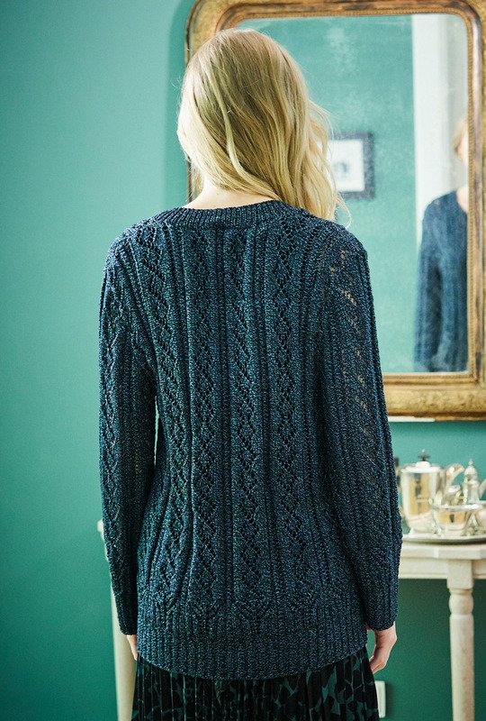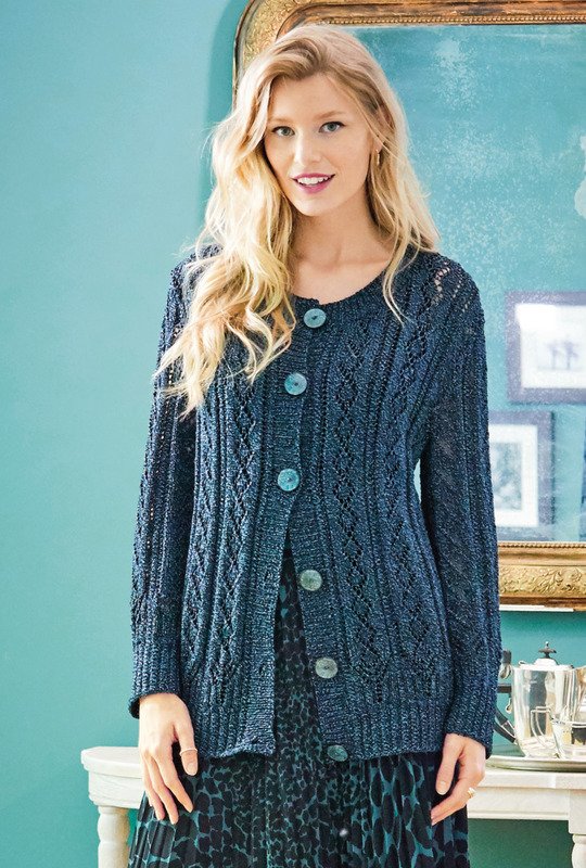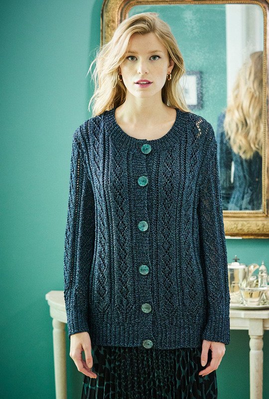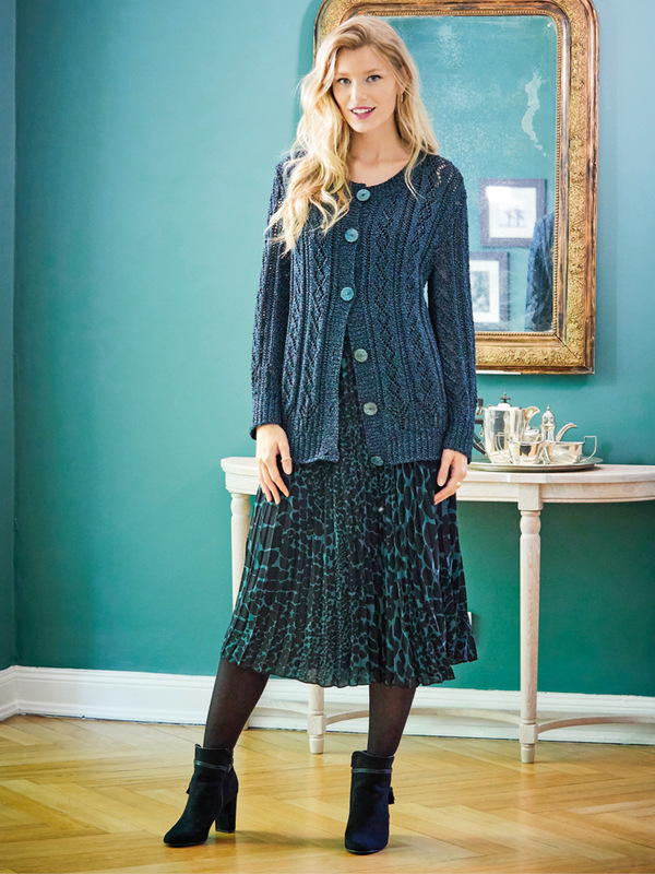 Diese Jacke hat Bestseller-Potential: Einerseits durch den geheimnisvollen Petrolton, andererseits durch das Zopf-Ajourmuster, bei dem die schimmernde Seidenbeimischung im Schurwollgarn dezente Glanzlichter setzt. Die Bündchen an Saum und Ärmeln sind in 2/2-Rippen gearbeitet, die Knopf- und Ausschnittblenden in 1/1-Rippen. Eine gute Passform an den Schultern garantieren die Ärmel mit Armkugel. Wir empfehlen hellere grüne Knöpfe mit Perlmuttschimmer, da sie einen kleinen Glanzpunkt setzen. Ergebnis ist ein Cardigan, den du zu vielen Gelegenheiten tragen kannst. Die Anleitung steht zum Download bereit für die Größen 34/36 und 42/44.