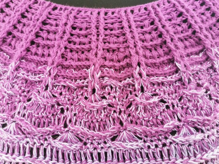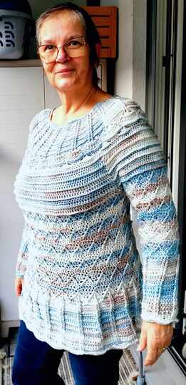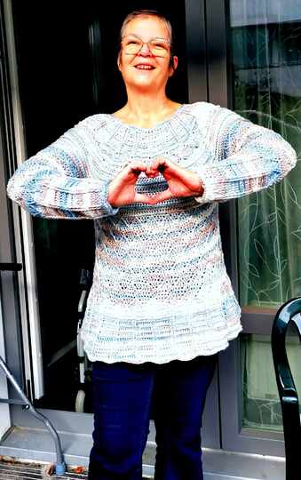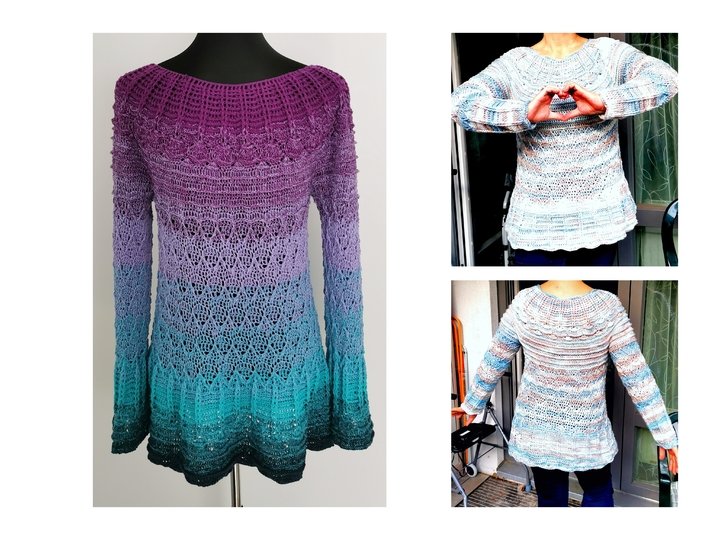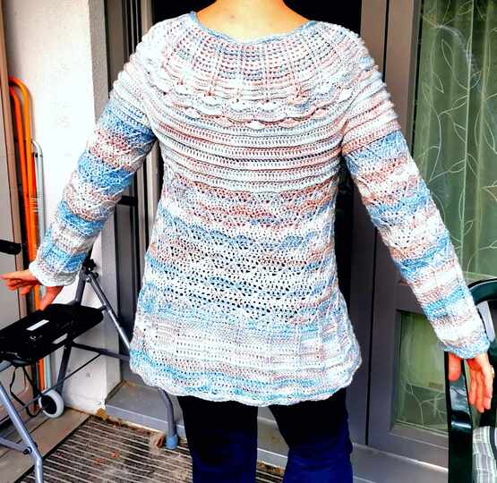 Der Pulli wird in einem Stück von oben nach unten gearbeitet, die Ärmel werden extra angehäkelt.