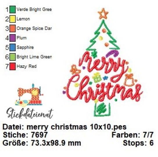 Diese Stickdatei präsentiert einen stilisierten Weihnachtsbaum, der durch seine klaren und modernen Linien besticht. Der Baum besteht aus mehreren geometrischen Formen, die übereinander gestapelt sind, um die traditionelle Silhouette eines Weihnachtsbaums zu erzeugen. Jede Ebene des Baums ist mit feinen Details versehen, die Tiefe und Textur hinzufügen. Mittig im Baum befindet sich der Schriftzug "Merry Christmas" in einer eleganten und festlichen Schriftart. Die Buchstaben sind sorgfältig gestaltet und verleihen dem Design einen Hauch von Klassik und Eleganz.