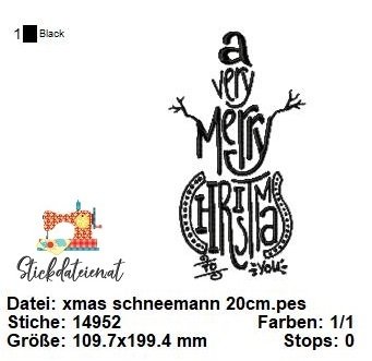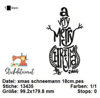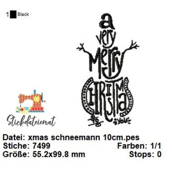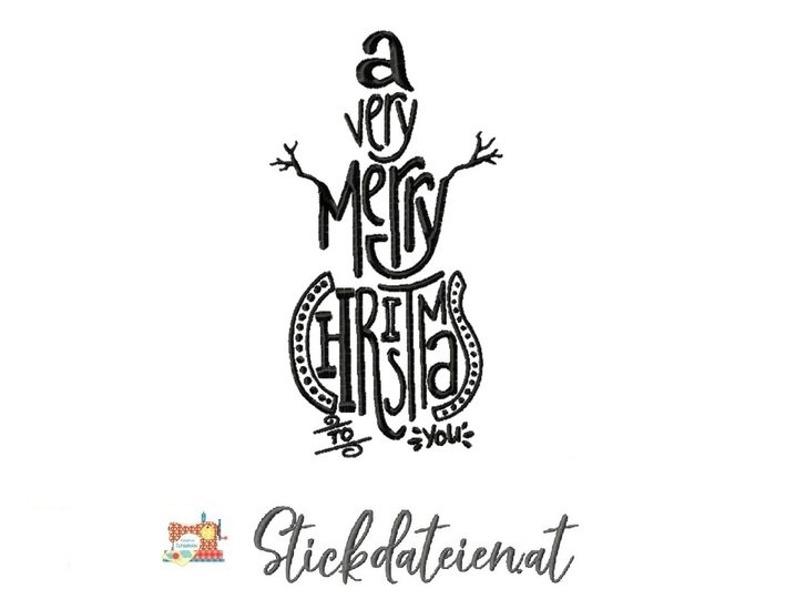 Diese Stickdatei zeigt einen charmanten Schneemann, der inmitten des festlichen Schriftzugs "A Very Merry Christmas" platziert ist. Der Schriftzug ist in einer eleganten Schreibschrift gehalten, die die festliche Stimmung unterstreicht.