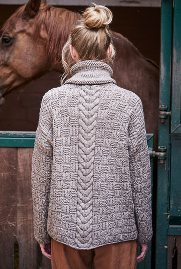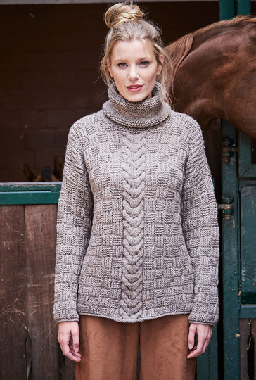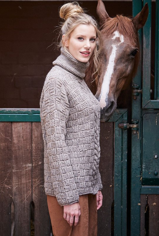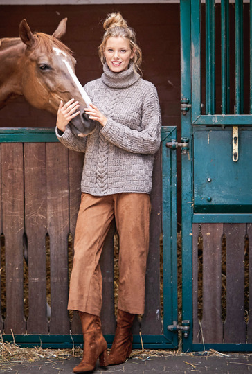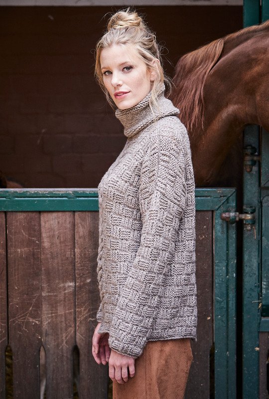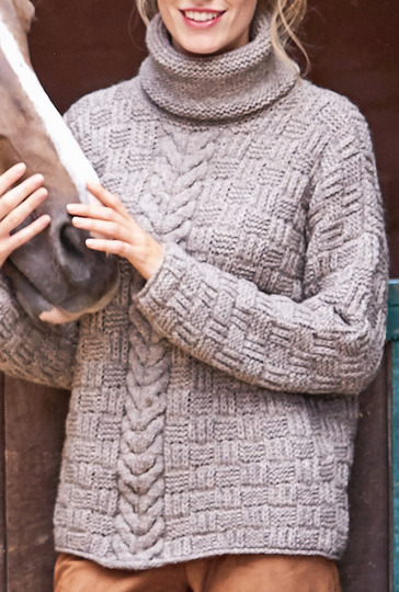 Ein klassischer Mustermix, bei dem rustikale Karos aus kraus rechts und Patentmuster und in der Mittellinie ein plastischer Zopf zum Einsatz kommen. Glatt rechts gestrickte Reihen dazwischen lassen das Muster wie geflochten wirken. Alle Säume haben einen schmalen, glatt rechts gestrickten Rollrand, der üppige Rollkragen ist kraus rechts gestrickt. Typisch für die lässigen Pullover dieser Saison sind die überfallenden Schultern. Das griffige Mischgarn mit hohem Alpaka-Anteil lässt sich wunderbar verstricken. Die Anleitung dazu kannst du in den Größen 38/40 und 44/46 downloaden.