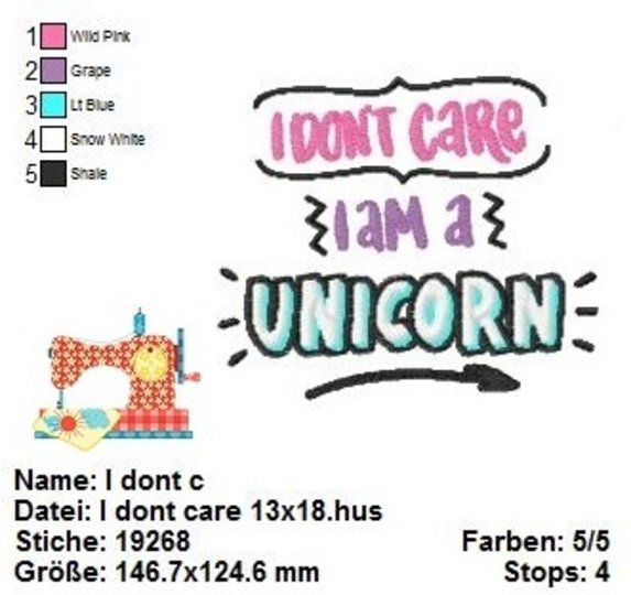 Diese einzigartige Stickdatei präsentiert den humorvollen und selbstbewussten Spruch "I don't care, I am a unicorn". Der Spruch ist in einer spielerischen und kreativen Schriftart gestaltet, die die fröhliche und unbeschwerte Botschaft des Textes unterstreicht.