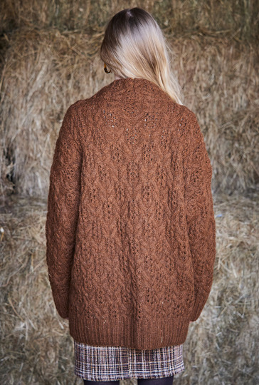 Diese gemütliche Jacke mit Zopf-Ajourmuster passt sich jedem Stil an. Mit ihrem warmen Braunton sieht sie natürlich zum Karokleid besonders trendy aus, macht aber auch zu weiten Hosen oder sportlichen Jeans eine gute Figur. Das fulminte Zopf-Ajourmuster kommt auch am doppelt gestrickten Stehkragen zur Geltung. Alle Bündchen werden im 2/2-Rippenmuster gearbeitet. Die doppelte Knopfleiste wird nachträglich im 1/1-Rippenmuster angestrickt. Wer gerne etwas aufwändigere Muster strickt, für den/die ist dieses Modell genau das Richtige. Die Anleitung dazu ist für die Größen 40/42 und 48/50 vorhanden.