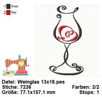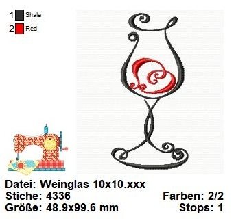 Diese Stickdatei zeigt ein elegantes Weinglas, das mit großer Detailgenauigkeit gestaltet ist. Die Linien des Glases sind geschwungen und verleihen ihm eine anspruchsvolle und edle Optik. Die Reflexionen und Schattierungen im Glas sind sorgfältig gestickt, um Tiefe und Realismus zu erzeugen.