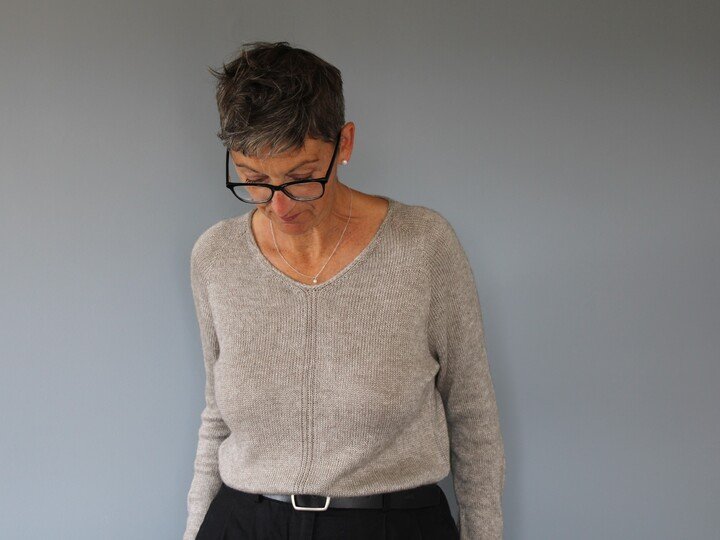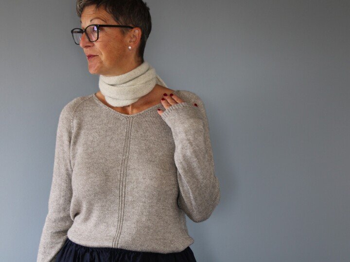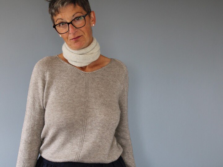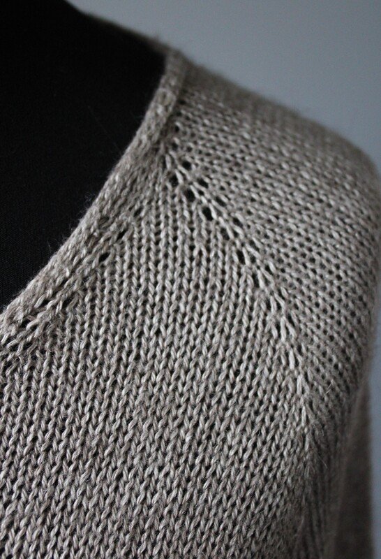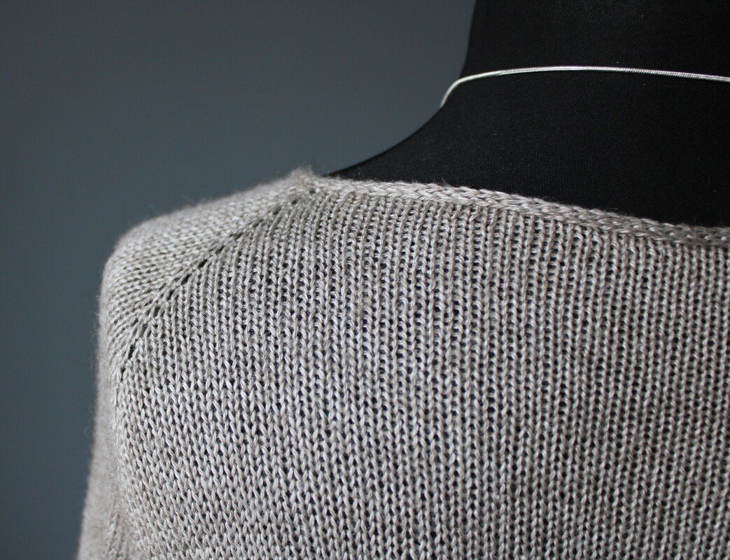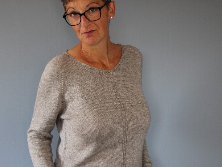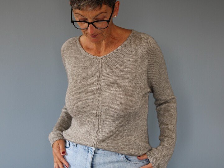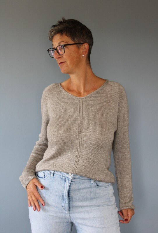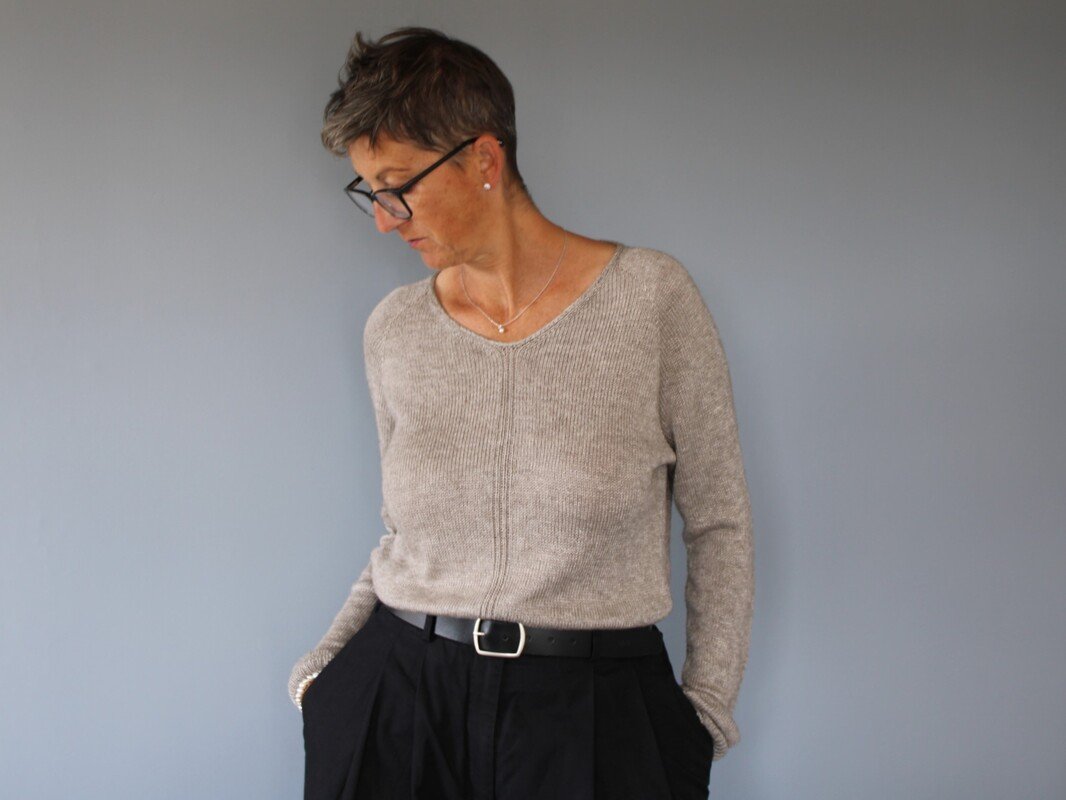 Moon River ist ein top down gestrickter Raglansweater mit V-Ausschnitt und kurzen oder langen Ärmeln. Die Form ist sportlich-elegant.