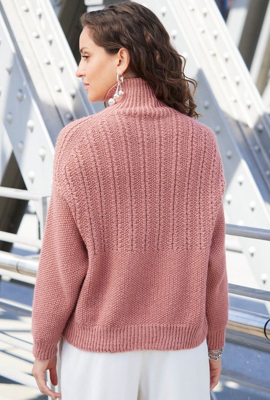 Rechte und linke Maschen, dazu schmale Zopfstreifen: Auch mit einfachen Mustern kann man tolle Effekte erziehen – wie der korallenfarbene Sweater aufs Schönste beweist. Am auffälligsten ist die außergewöhnliche, um nicht zu sagen modern und hip aussehende hohe Schulterschrägung an denen entlang zwei kleine Zöpfchen weiterlaufen. Vorder- und Rückenteil beginnen mit einem Rippenbund, gefolgt vom kleine Perlmuster und im Brustbereich das Zopfmuster, das gar nicht wie ein solches wirkt. An den Ärmeln wird auf das Zopfmuster verzichtet und ganz im kleinen Perlmuster gestrickt. Zu diesem besonderen Modell passt das edle Garn aus einer Mischung von Mohair, Lamawolle und Seide. Eine Anleitung ist für Größe 38/40 und 42/44 sowie 46/48 vorhanden.