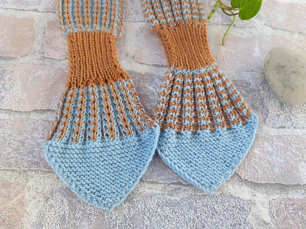 Das zweifarbige Muster wird sehr weich und dehnbar und passt sich gut an die kleinen Füsschen an. Durch das umgeschlagene Bündchen halten die kleinen Schuhe gut an den Füßen, auch bei aktiveren Babys .