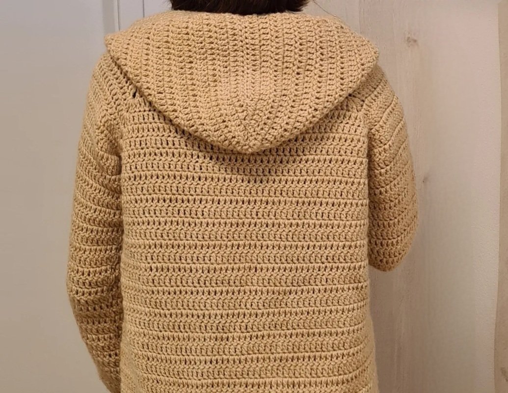 Die Jacke wird von oben nach unten an einem Stück gehäkelt. Lediglich für die Ärmel und die Kapuze muss der Faden neu angeschlagen werden. Lästiges zusammennähen von Einzelteilen bleibt dir also erspart.