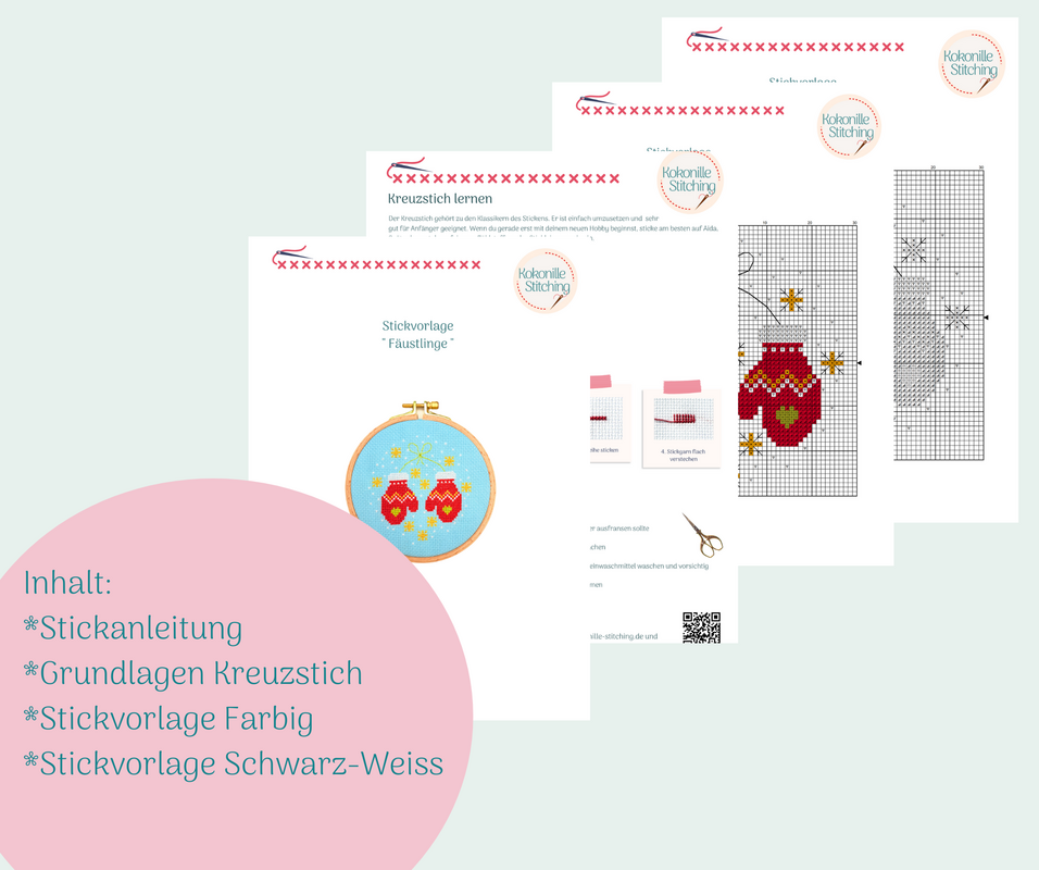 Die Datei enthält auf 8 Seiten eine kurze Beschreibung der benötigten Materialien, einen Grundkurs bzw. die Grundlagen für Kreuzstich in Deutsch und in Englisch, die Stickvorlage mit dem Farbschlüssel für die DMC Garne, Anchor und Rico.