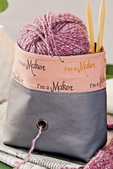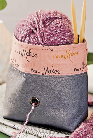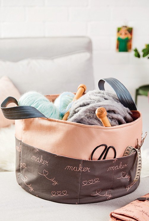 Eine rundum genähte Außentasche um den großen Wollkorb hält Schere, Maßband & Co. bereit. Mit dem praktischen, mit einer Öse ausgestanzten Loch an der Vorderseite des kleinen Körbchens zur Führung des Garnes ist das Verheddern des Knäuelfadens ausgeschlossen.