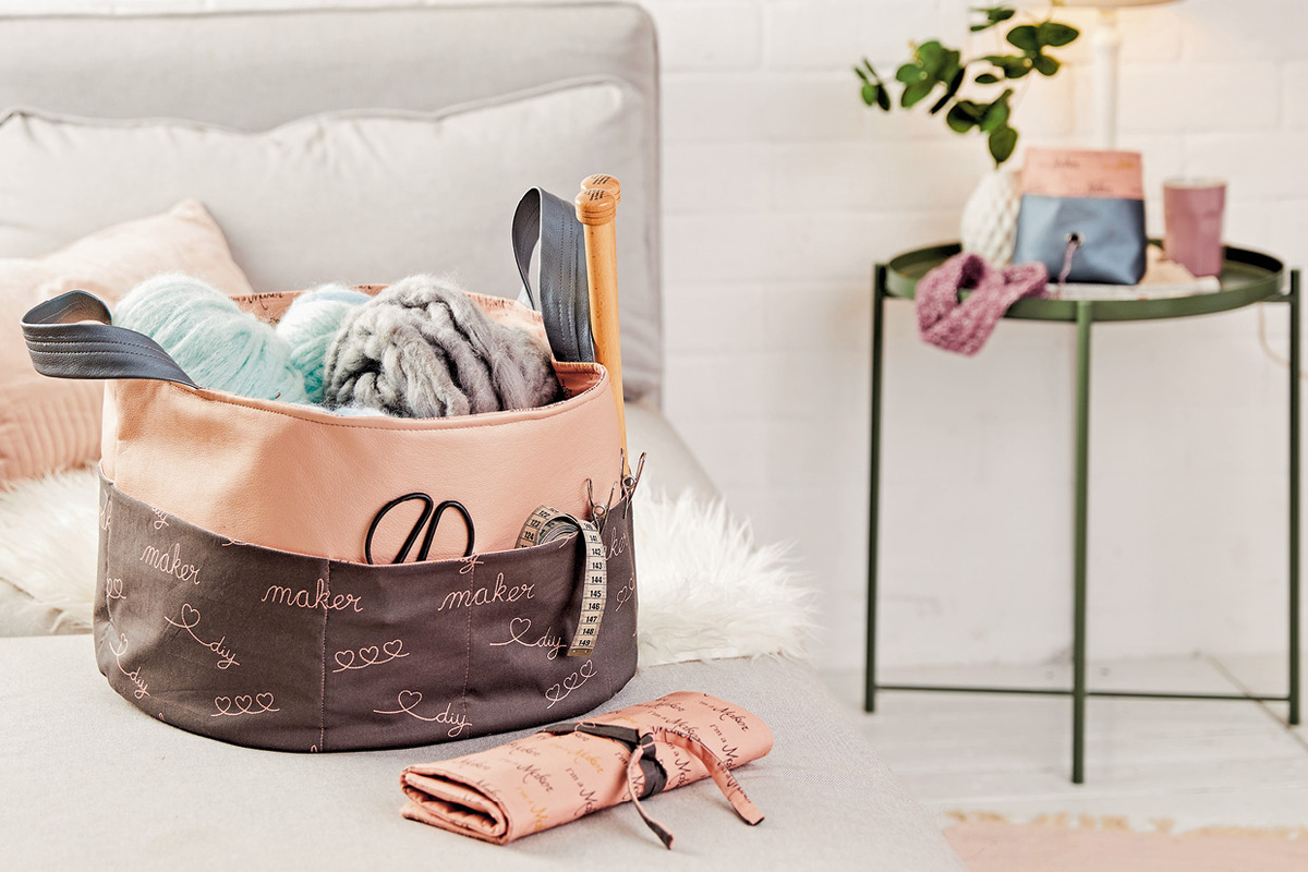 Kreativ aufbewahrt: In den Wollkörben und der Nadelmappe sind Garn, Nadeln und Zubehör dekorativ und praktisch verstaut.