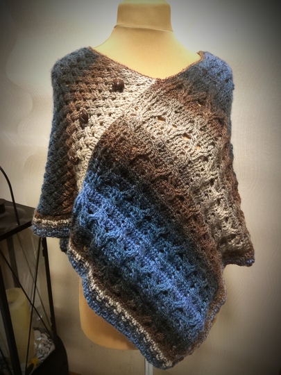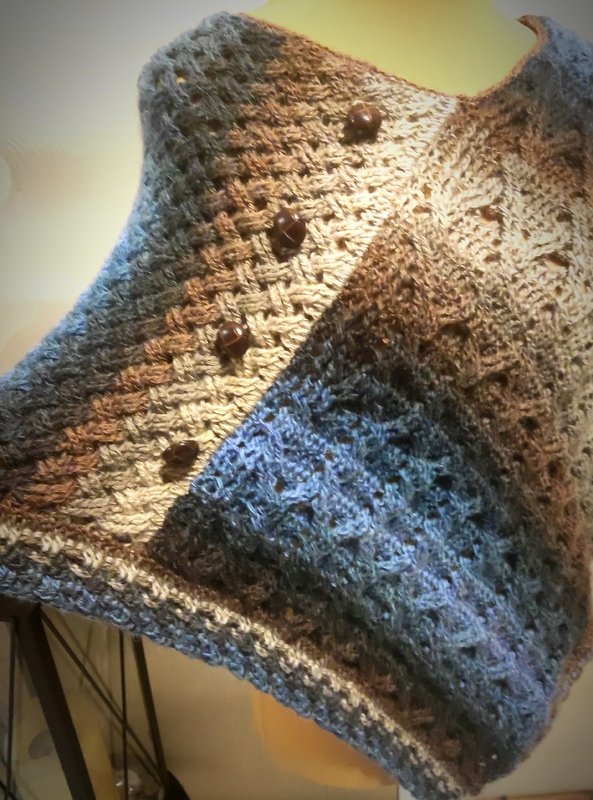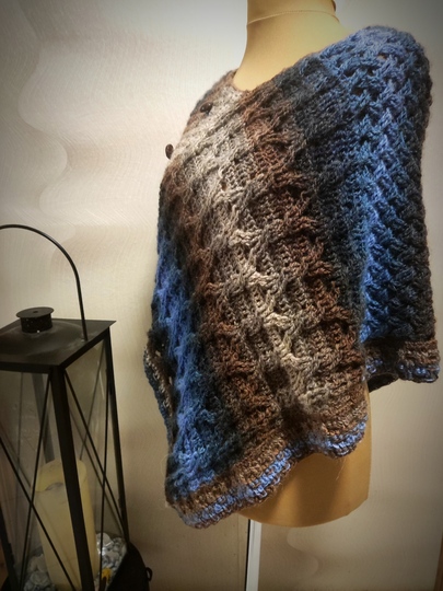 Der Poncho auf dem Bild entspricht der Größe S und reicht bis ca. zum Ellenbogen - in der Anleitung sind jedoch auch die Angaben für weitere Größe, so dass man sich den Poncho auch bis hin zur Oversize-Größe häkeln kann.