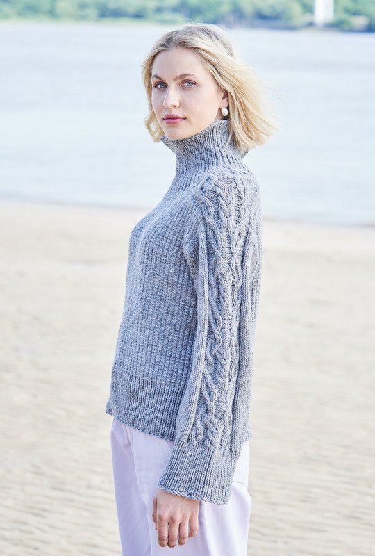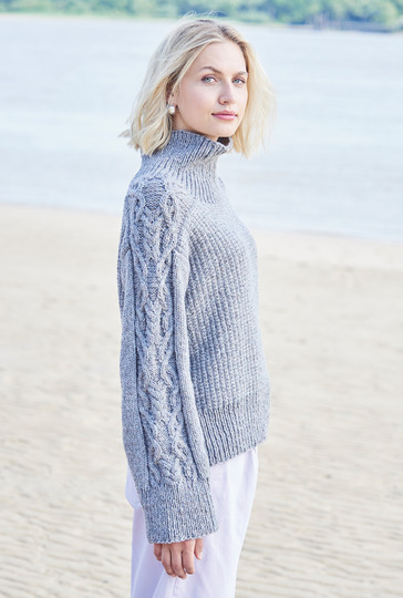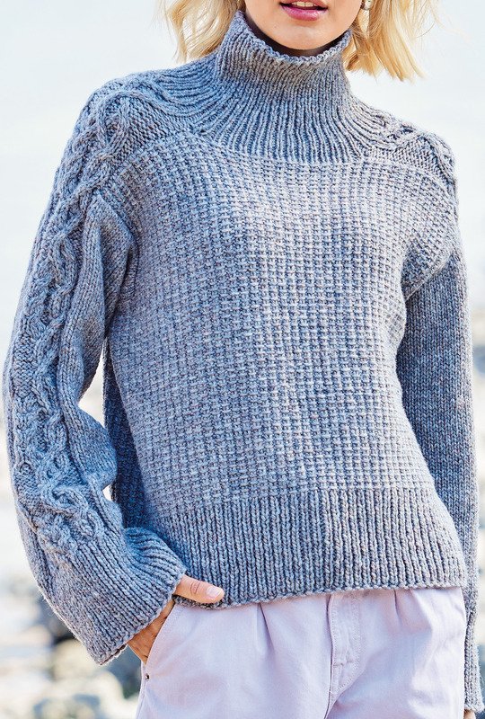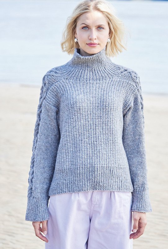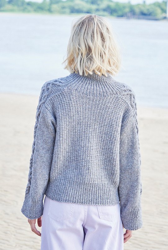 Traditionelle Muster sind nach wie vor angesagt, allerdings in neuem Mix. Hier ist es ein feines Webmuster, das mit einem markanten Zopfgeflecht an den Ärmeln kombiniert wird. Diese Zöpfe laufen über die Schulter als Passe weiter. Alle Rippenbündchen beginnen mit einem doppelten Kreuzanschlag, was sie besonders interessant macht. Die Ärmel sind von Beginn an weit und ganz gerade – das erleichtert das Einnähen. Um den Hals schmiegt sich ein kurzer Kragen aus 1/1-Rippen, der auch mal umgeschlagen werden kann. Eine Anleitung ist für die Größen 38/40, 42/44 und 46/48 vorhanden.