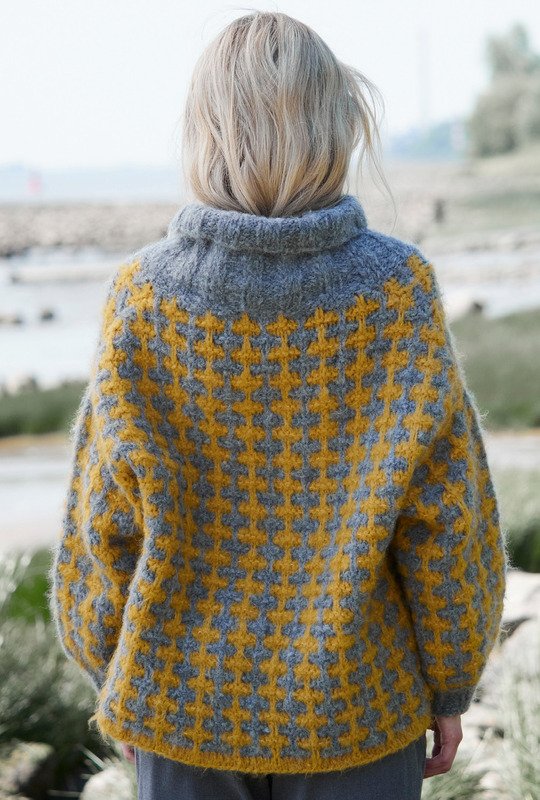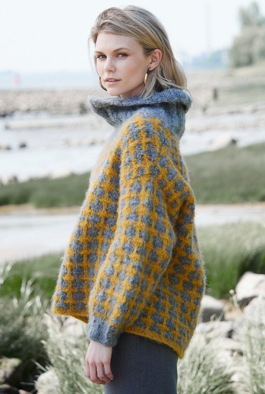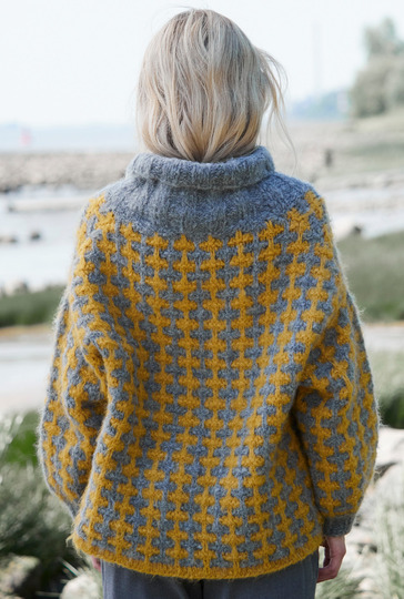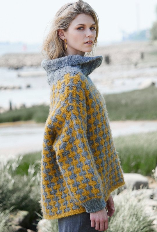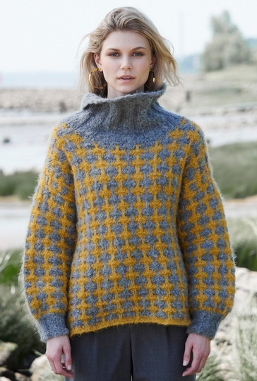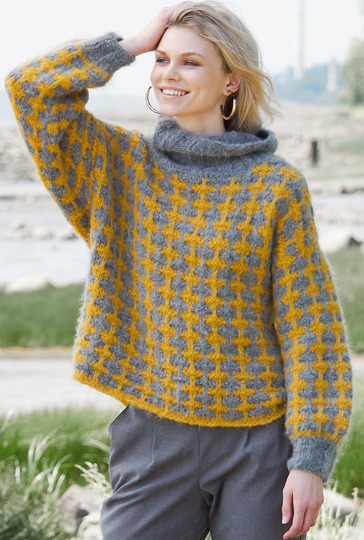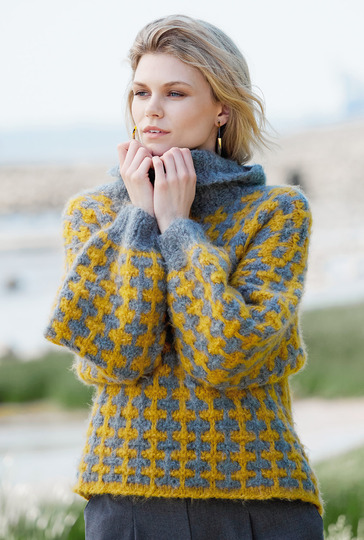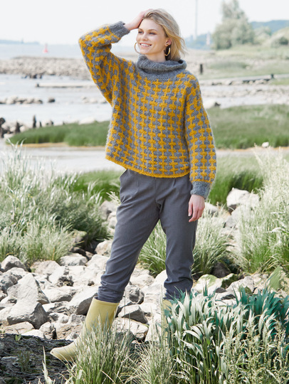 Hier entsteht die Karo-Optik durch Hebemaschen – ein einfaches Muster, bei dem pro Reihe nur mit einer Farbe gestrickt wird. Elastische Rippenbündchen an den Ärmeln und der hohe Rollkragen, beides in Grau, bilden das Finish. Der Halsausschnitt ist extra etwas weiter gearbeitet, so dass sich die Rippen zu Beginn des Rollkragens schön um den Hals legen können. Ein Modell, an das sich auch Strickneulinge mit ein wenig Erfahrung gut wagen können. Die Anleitung dafür gibt es in den Größen 36/38, 40/42 und 44/46.