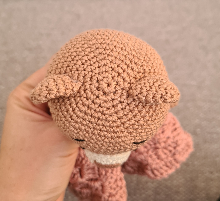Farben: Baumwollgarn (Catania, Sandy 165) 1x Hellbraun, 1x Cremeweiß, Altrosa (etwas mehr als 1 Knäuel ca. 60g) Außerdem benötigst du ein wenig Weiß und etwas Schwarz für das Gesicht.