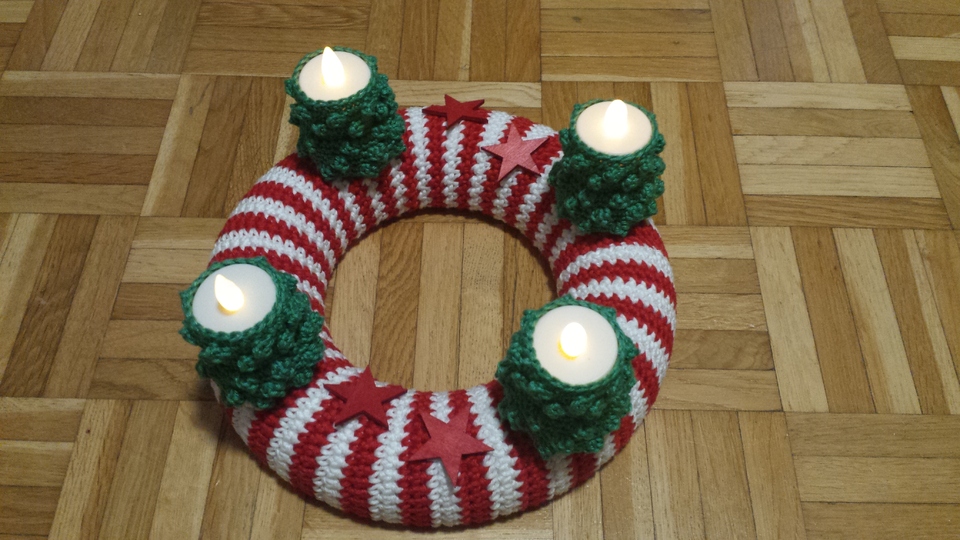Häkelanleitung für einen weihnachtlichen Adventskranz mit Bäumchenkerzen. Diese Produkt enthält nur die Anleitung und keinen fertigen Adventskranz. Viel Spaß beim Häkeln!