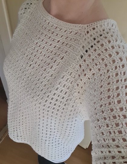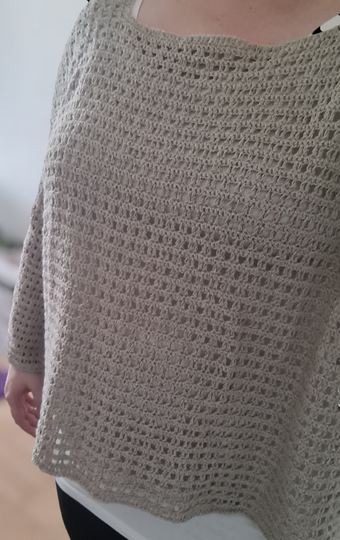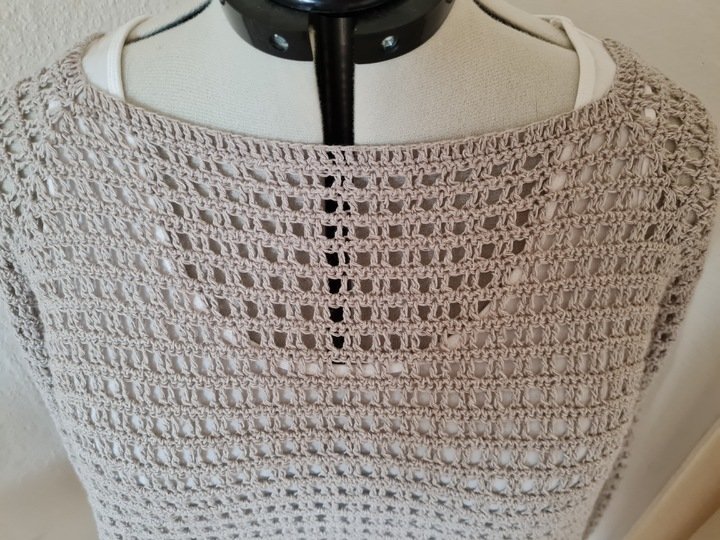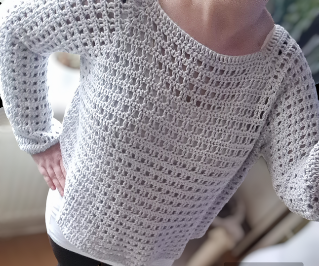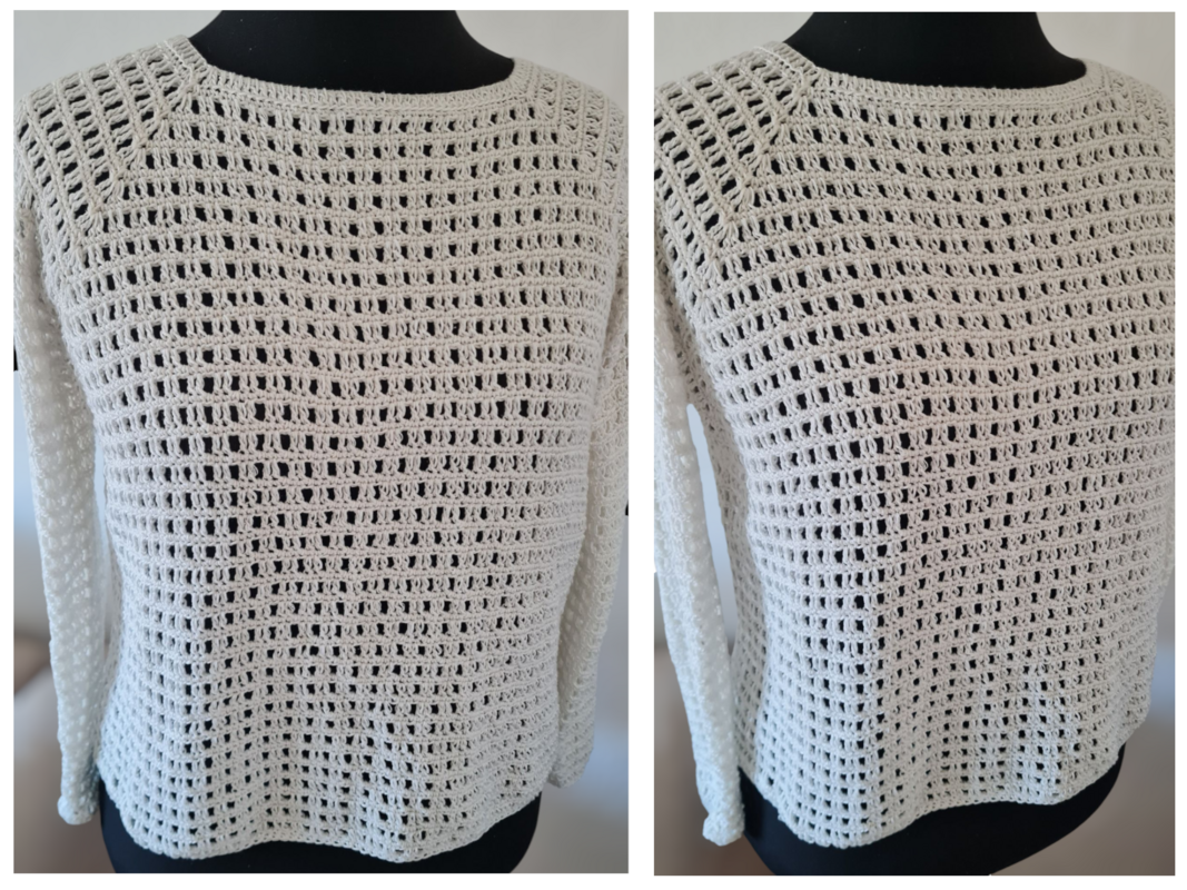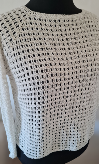 Der abgebildete Netzpulli wurde in der Größe 42/44 gearbeitet.