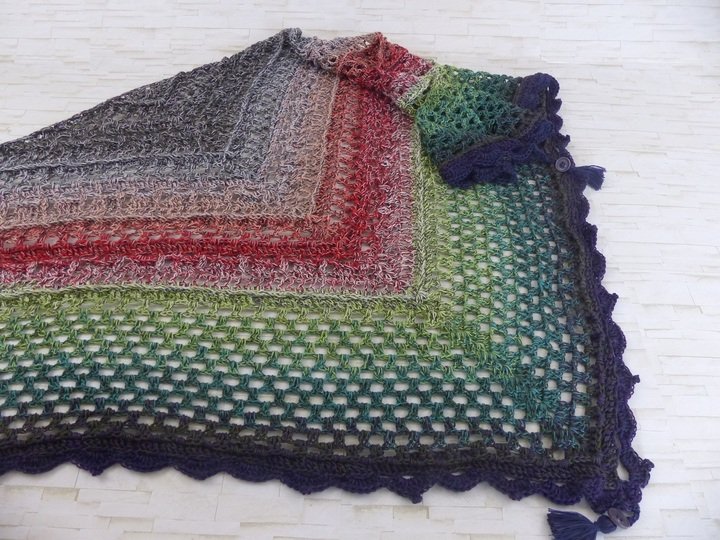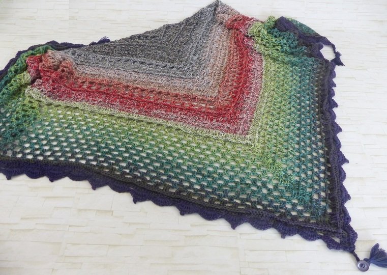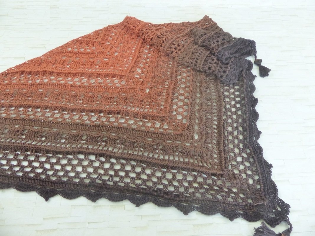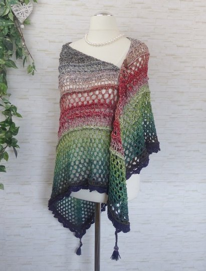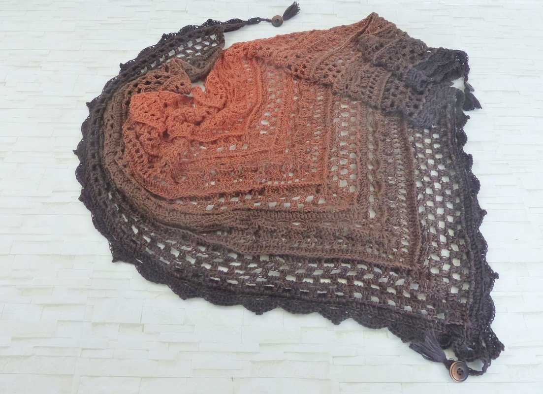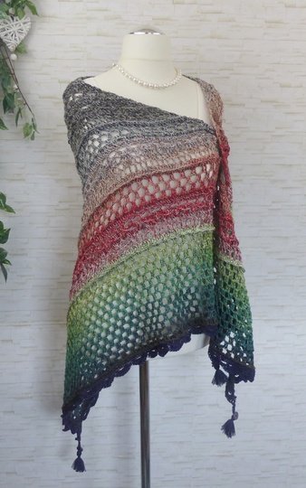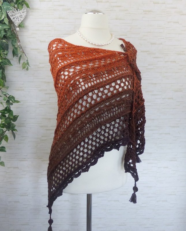 Aufgrund der eingearbeiteten vorderen Reliefstäbchen ist das Muster beidseitig sehr schön. Es ist somit ein Wendetuch - wie es getragen wird, ist egal. Auch kannst Du dich entscheiden, ob mit oder ohne Quasten. Diese sind mittels eines Knopfes befestigt, somit abnehmbar.