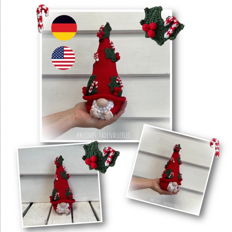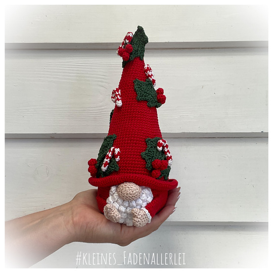 Der Gnome wird mit Baumwollgarn (125 m ~ 50 g) und Nadelstärke 2,5 mm gehäkelt. Es wird eine Gesamthöhe von ca. 25 cm und eine Breite von ca. 12 cm erreicht. Dieses kann jedoch je nach verwendetem Garn, Nadelstärke und deiner Häkelfestigkeit variieren.