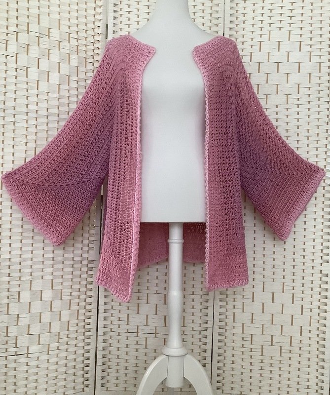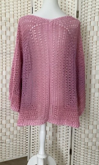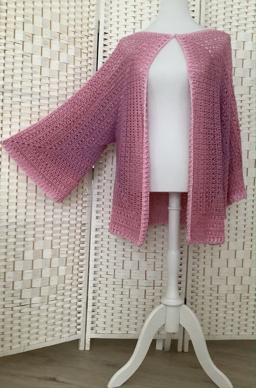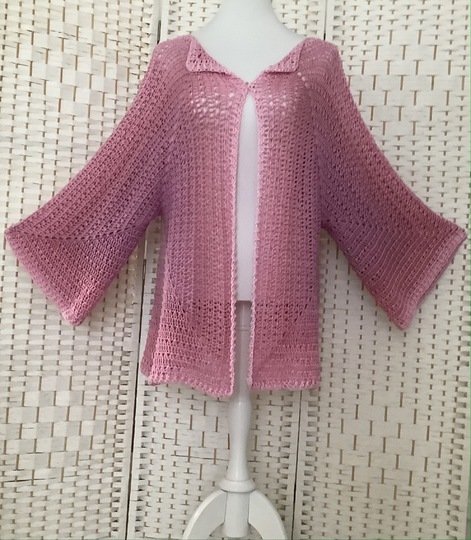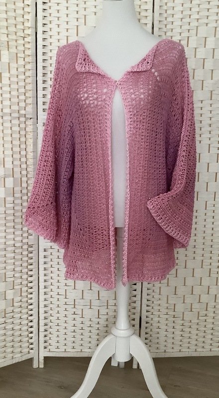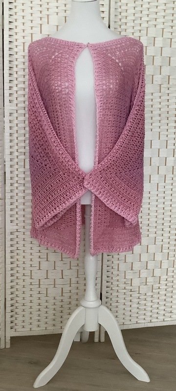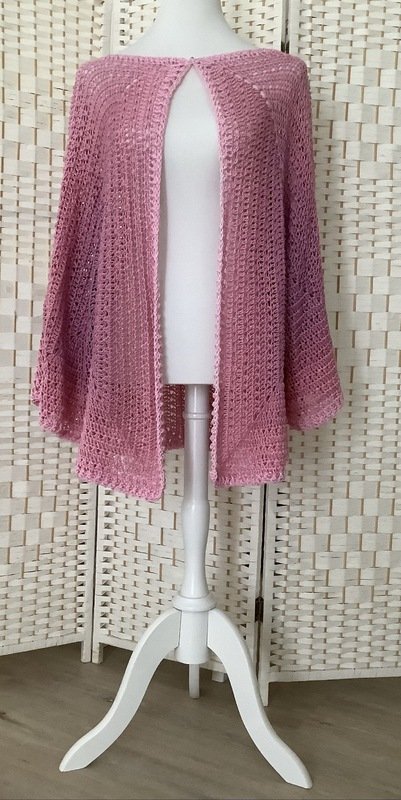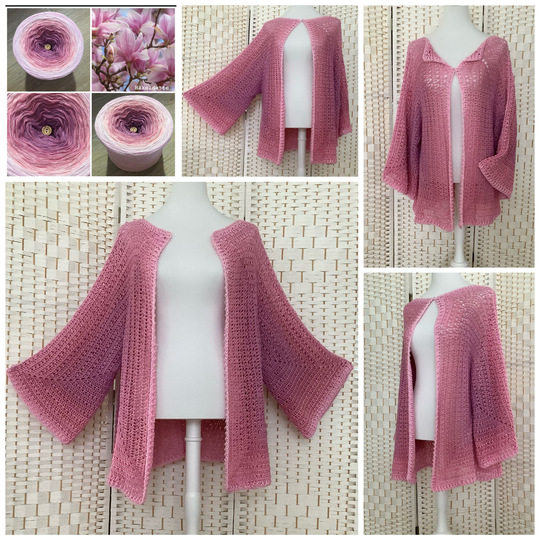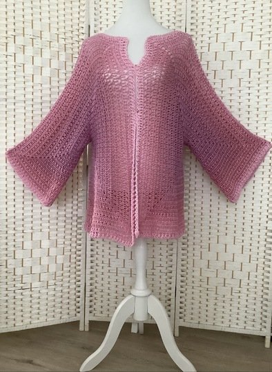 Die schöne Jacke ist ein Onesize-Modell und für nahezu jedes Garn geeignet. Durch den Schnitt ist sie sehr locker und weit geschnitten.