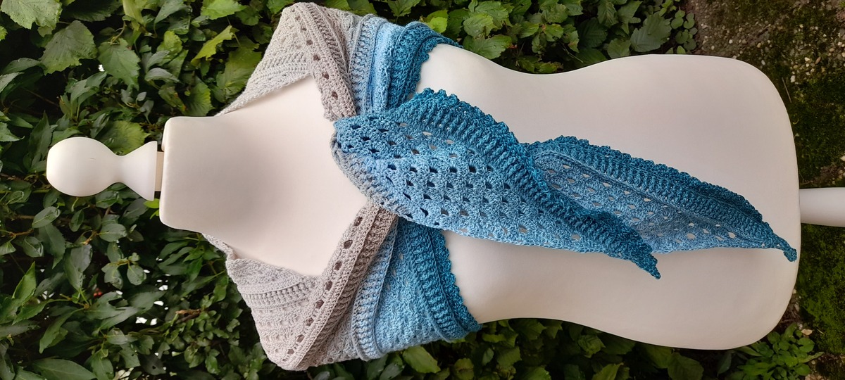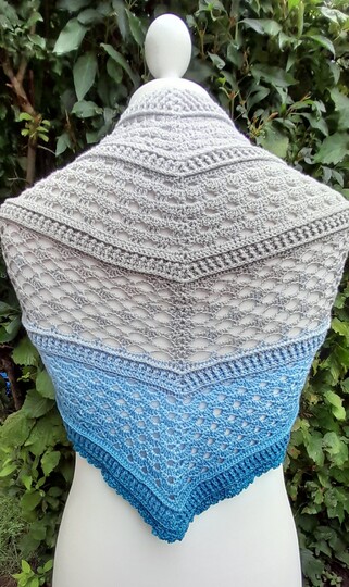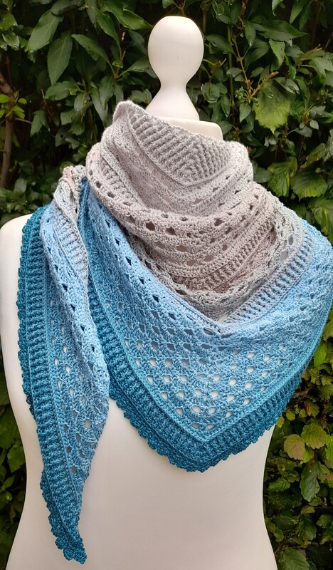 Das blaue Tuch auf den Fotos wurde aus dem 4fädigen Bobbel "Steife Briese" von Wollfamos/Yarn Box hergestellt.