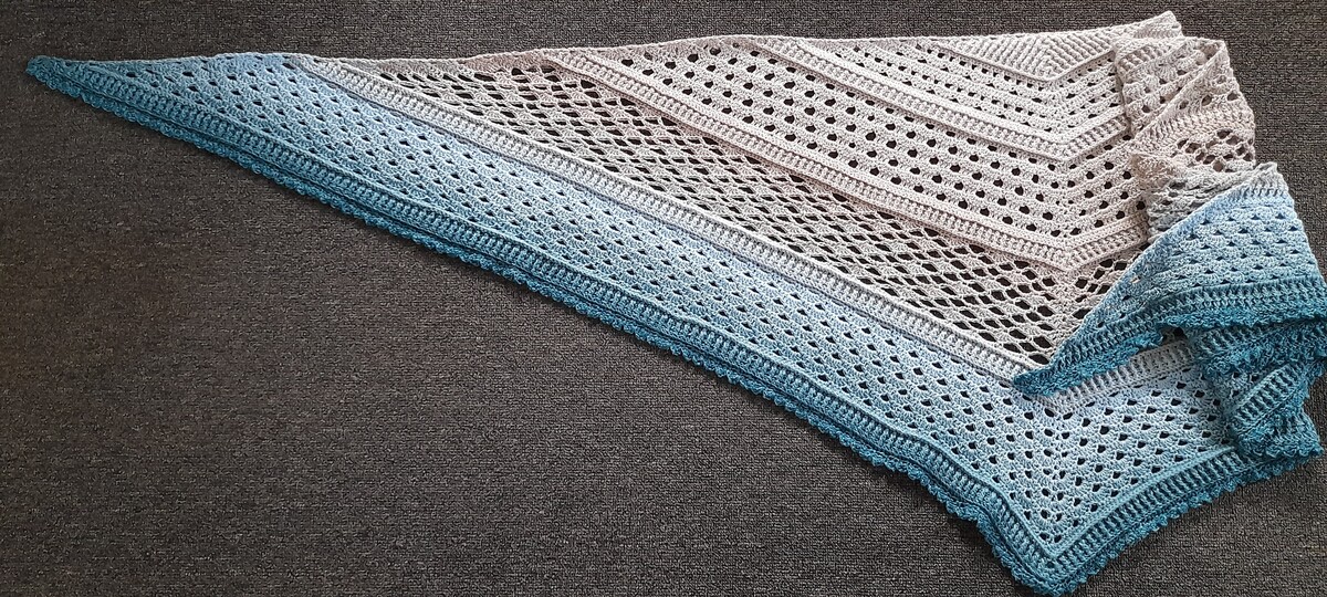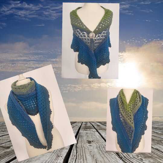 Nordseewelle ist ein flaches Dreieckstuch mit vielen, verschiedenen Muschelmustern.