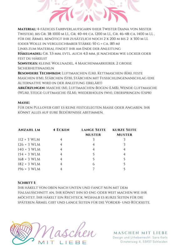 Garn: 4-fädiges Farbverlaufsgarn (hier Twister Diana lachs von Mister Twister), bis Gr. 38: 1000 m LL, Gr. 40-44: ca. 1200 m LL, Gr. 46-48: ca. 1400 m LL , für die Ärmel benötigt ihr zusätzlich noch 2 x 200 m bis 2 x 300 m LL (oder Wolle in vergleichbarer Stärke: 50 g = ca. 185 m)
