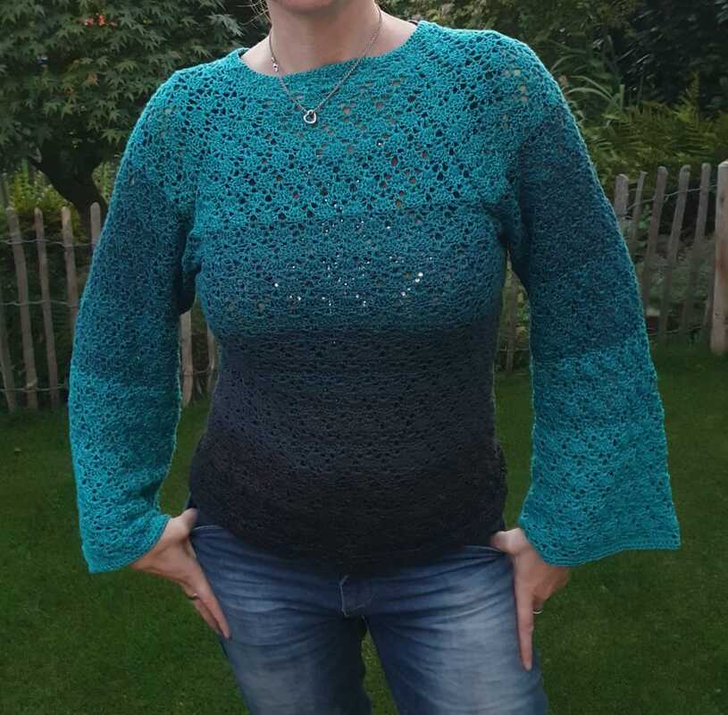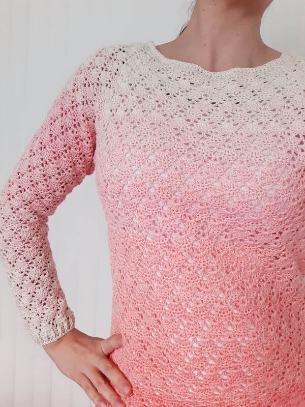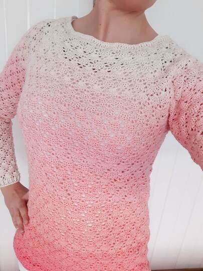 Dieser Pullover hat ein leichtes und zartes Ajour-Muster. Dadurch sieht er nicht nur edel aus, er fällt auch locker und fluffig. In der Anleitung sind viele Tipps enthalten. In einem CAL konnten auch Anfänger, die noch nie einen Pullover oder ein Kleidungsstück gehäkelt hatten, diesen Pullover häkeln.