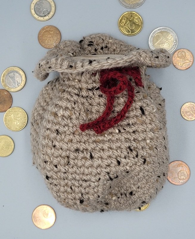 Wolle ( in meinem Fall 50g bei einer LL von 163m auf 100g ) für den Geldsack