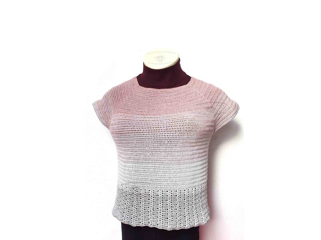 Da jeder anders (lockerer oder fester) häkelt und ggf. auch andere Zu- bzw. Abnahmen (z. B. am Busen) vornehmen muss, sind die angegebenen Materialmengen lediglich als Richtwerte zu beachten.