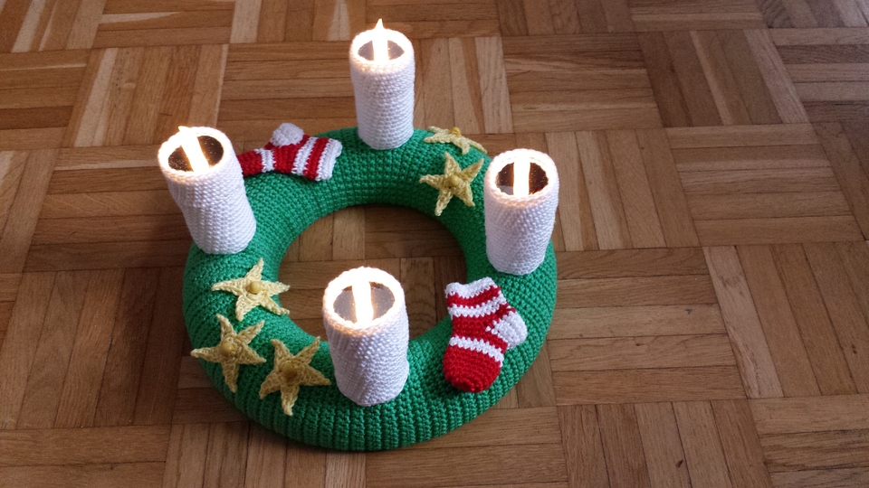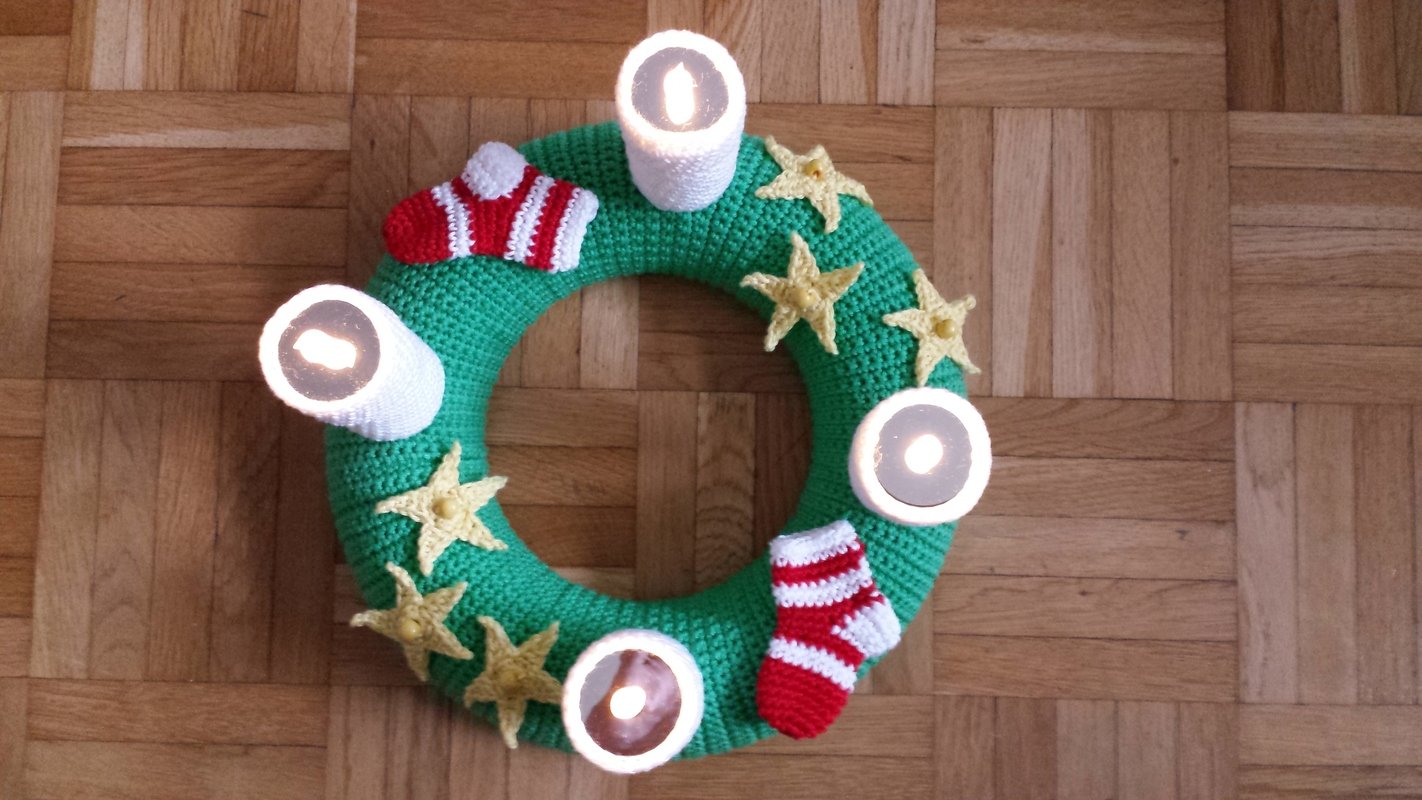 Weihnachtlicher Adventskranz mit Söckchen und Sternen. Dieses Produkt enthält nur die Anleitung und keinen fertigen Adventskranz.