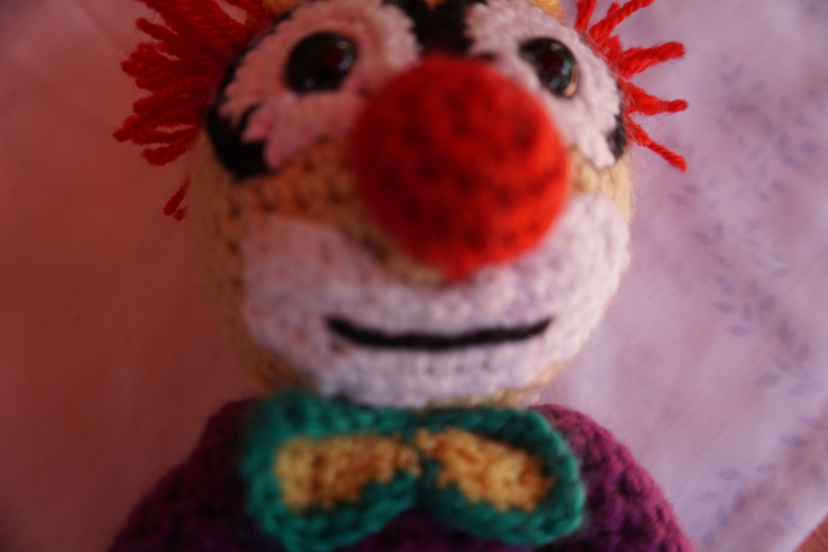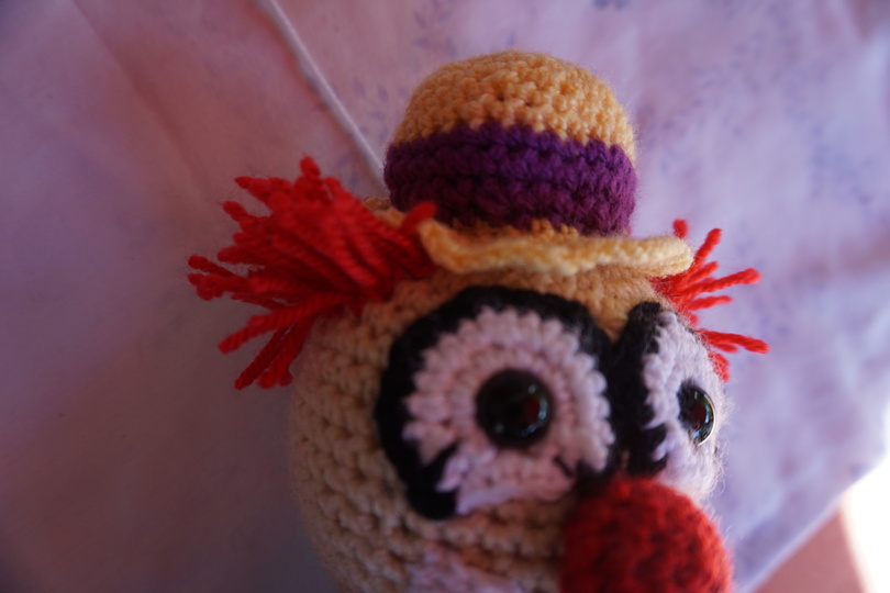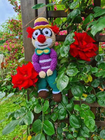 Clown Augusto ist ca 25cm groß mit gehäkelten Hut,Schuhen und Hose.